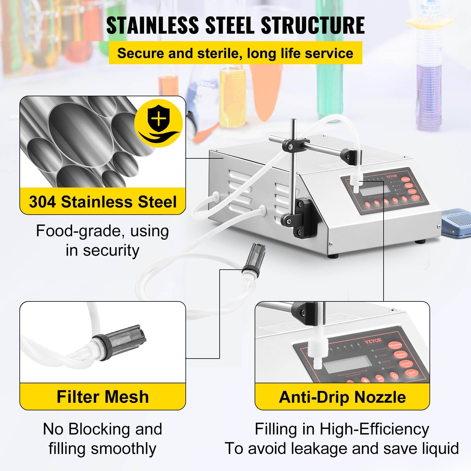 - Exakt vätskepåfyllning: Den digitala vätskepåfyllningsmaskinen styrs av en mikrodator med hög effektivitet, låg strömförbrukning och automatisk räknefunktion. LCD-skärmen är till för att du ska kunna styra och övervaka den noggrant. Påfyllningsvolym: 0,18–123,2 oz/5–3500 ml; Repetitivt fel: <0,5 %.