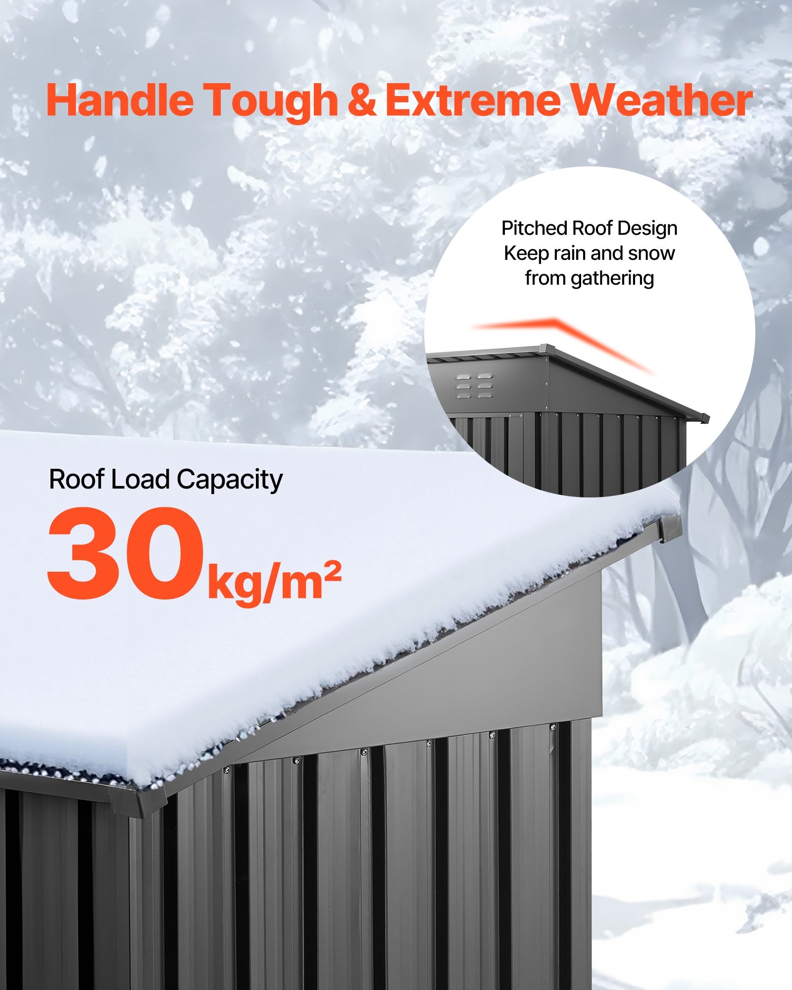 - Snö- och vattentålig: VEVOR trädgårdsskjul har ett sluttande tak som hjälper till att förhindra snö- och vattenansamling. Med en maximal lastkapacitet på 30 kg/m² är det byggt för att motstå tung snö, vatten eller skräp. Njut av en långvarig och robust förvaringslösning för utomhusbruk.