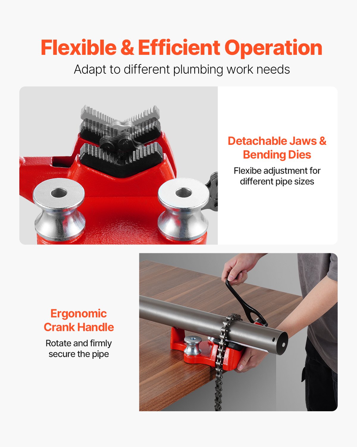 - Flexible Operation: Featuring detachable jaws and bending dies, this pipe vise meets different plumbing work needs. The ergonomic crank handle enables precise control of chain tightening, greatly enhancing work efficiency.