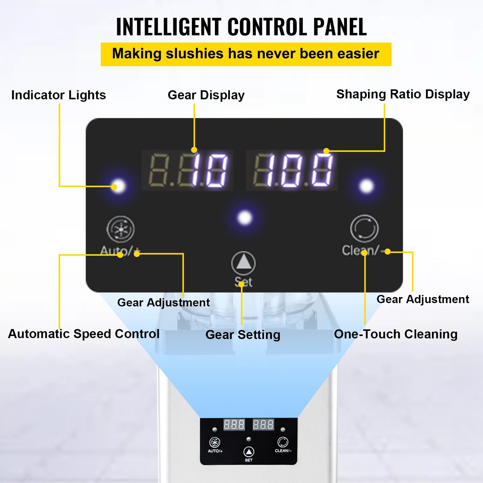 - Precise Control Area: A brief control panel promises ease of use for the commercial slushie machine. With a simple one-touch operation, you will have your favorite frozen drink ready to slurp. Two digital displays make gear and shaping ratio status clear at a glance. The automatic cleaning mode is also available to save effort.
