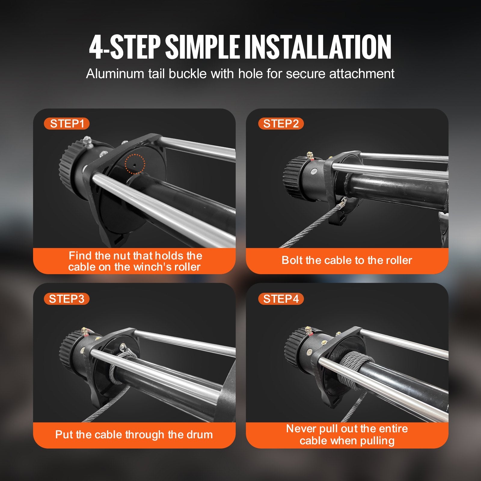 - Simple Installation: Installation's a breeze with our 4-step setup! Just tie, thread, and go – but avoid pulling out the entire winch steel cable during use. To prevent the cable from being cut by sharp edges on the guide plate, we recommend ensuring at least 3/8" to 1/2" of clearance between the opening of the fairlead and the edges of the mounting plate.