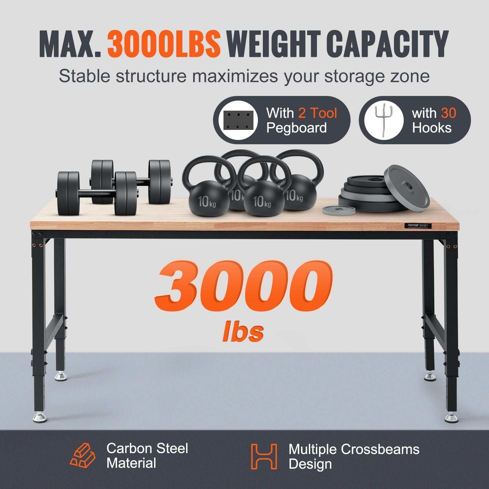 - Stabil struktur: Garagearbetsbänken är tillverkad av kraftigt kolstål med flera designade tvärstänger. Arbetsbänken är tillverkad av 1,2 tum (cirka 3 cm) tjockt gummiträ, vilket är hållbart och kraftigt.