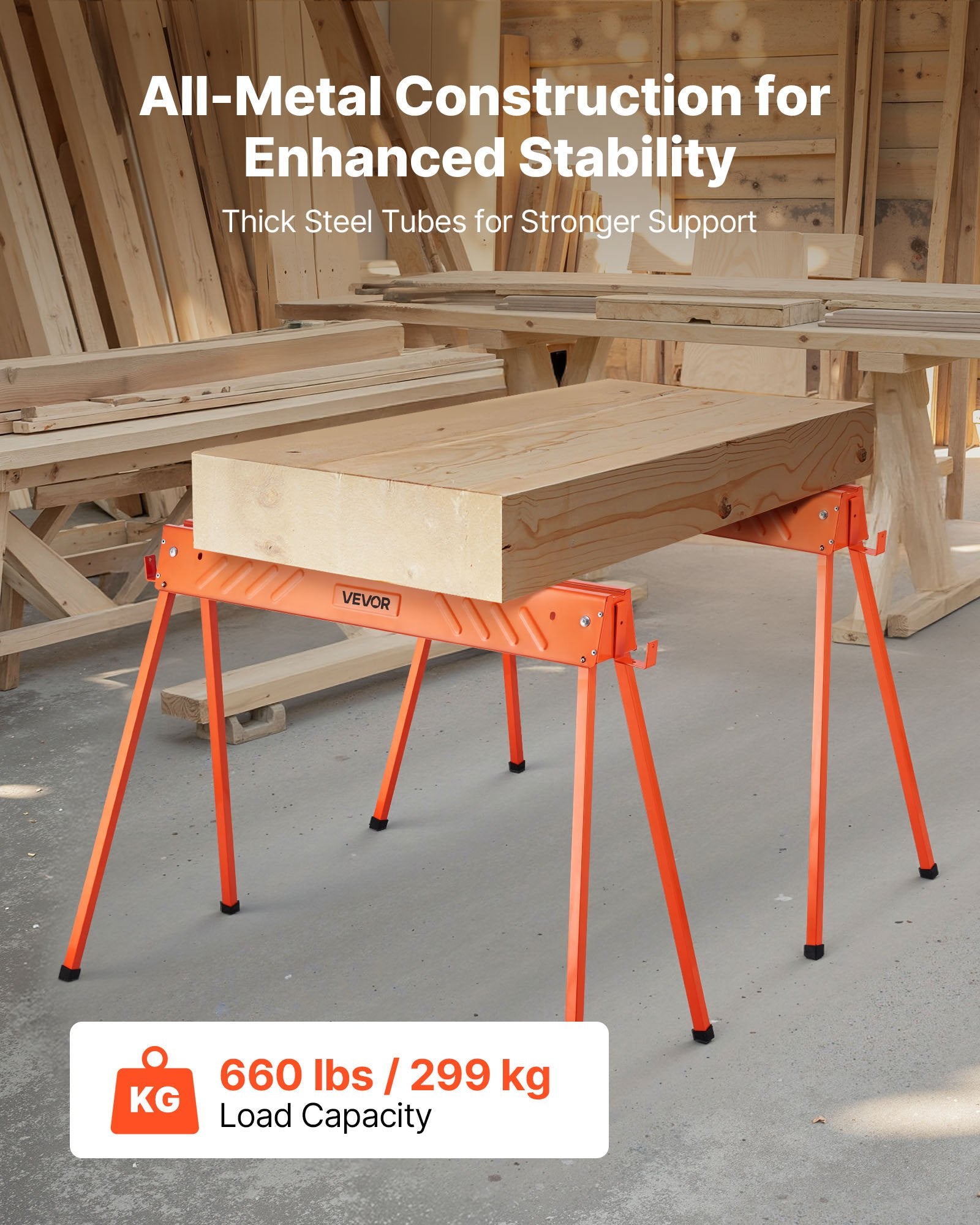 Sågbockar, 2-pack hopfällbara arbetsbockar, 299,4 kg lastkapacitet Sågbock med kraftiga ben, bärbar sågbock i helmetall med halkfria fotplattor, för träbearbetning, snickare och entreprenörer