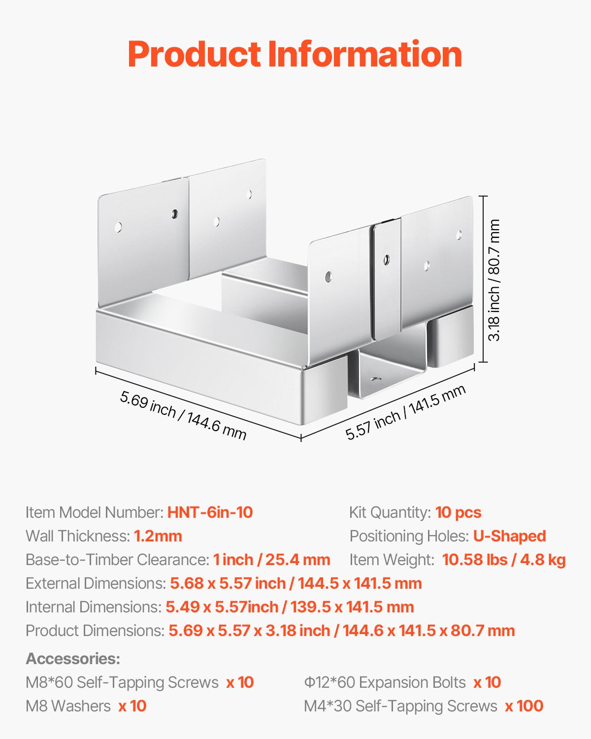 6x6 stolpfäste 10 st, innerstorlek 5,49x5,57 tum/139,5x141,5 mm betongstolpankare, kraftiga stolpfästen i förzinkat kolstål med 2,5 cm avståndshöjd, för betongpergolor/uteplatser