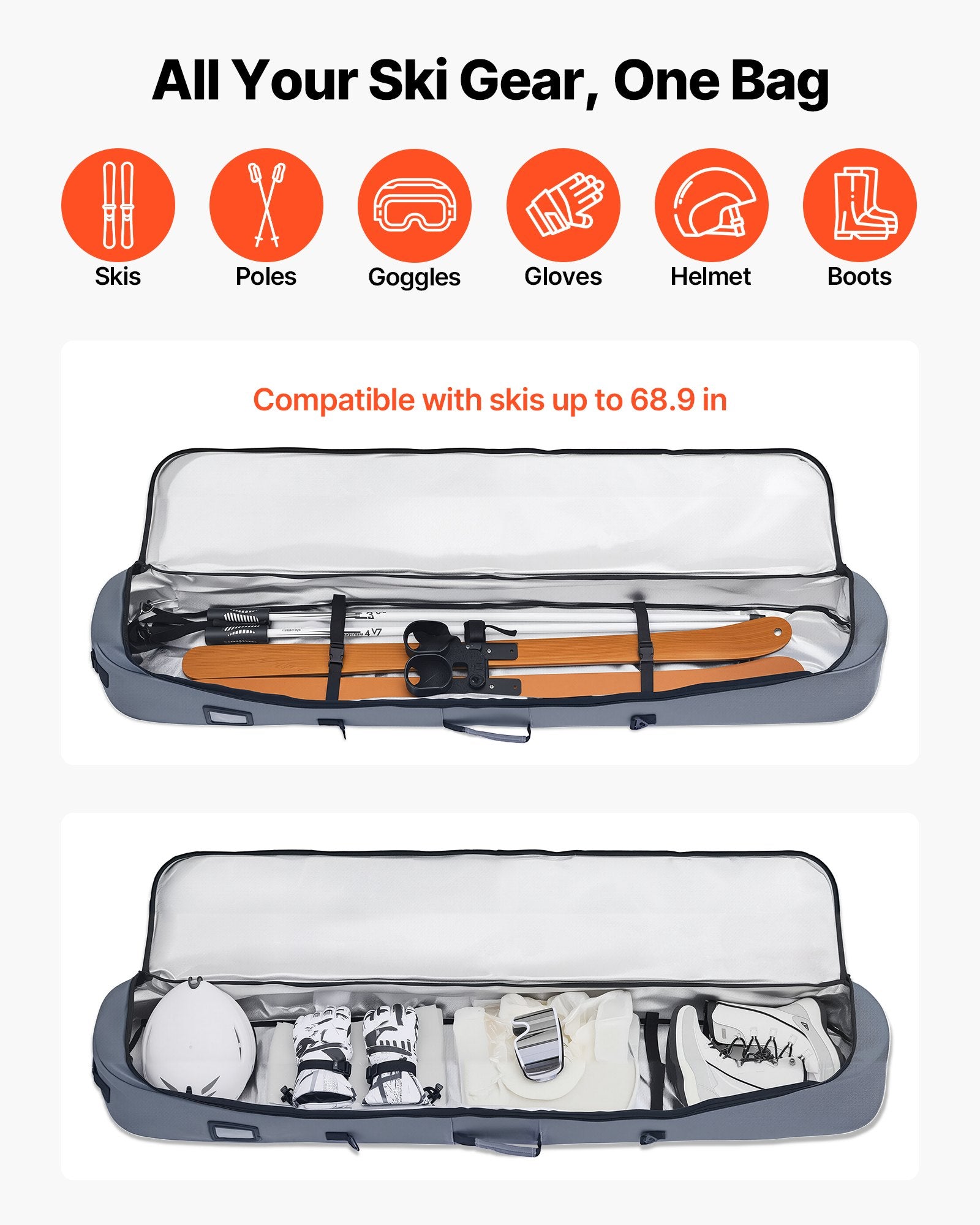 Snowboardväska, upp till 165 cm, vadderad skid- och snowboardväska för flygresor, 600D vattentät oxfordväv, med justerbara innerremmar, för skidstavar, skyddsglasögon, handskar, hjälm, stövlar (grå)