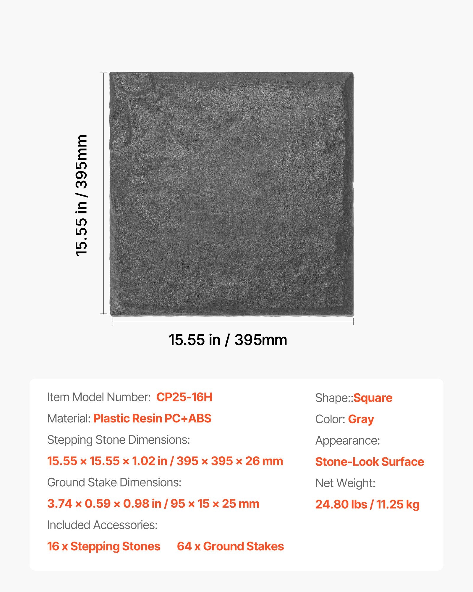 Trädgårdsstenar, 16 st 39,5x39,5 cm, Dekorativa trappstenar med pålar, Väderbeständiga plastgångstenar, Slät yta, Gångväg för utomhusbruk, Gräsmatta, Terrass, Landskap, Grå