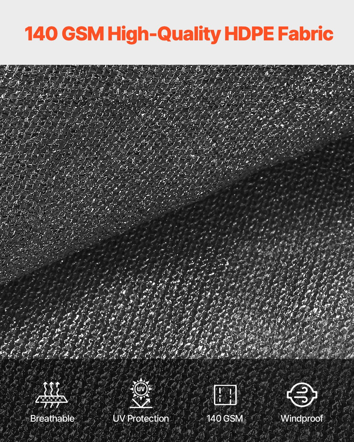 - Premiumtyg: Tillverkad av 140 GSM högdensitets HDPE, är denna skuggduk med 90 % material slitstark, vattentät och andningsbar. Den tål dagligt slitage samtidigt som den säkerställer luftcirkulation för långsiktig stabilitet i alla väderförhållanden.