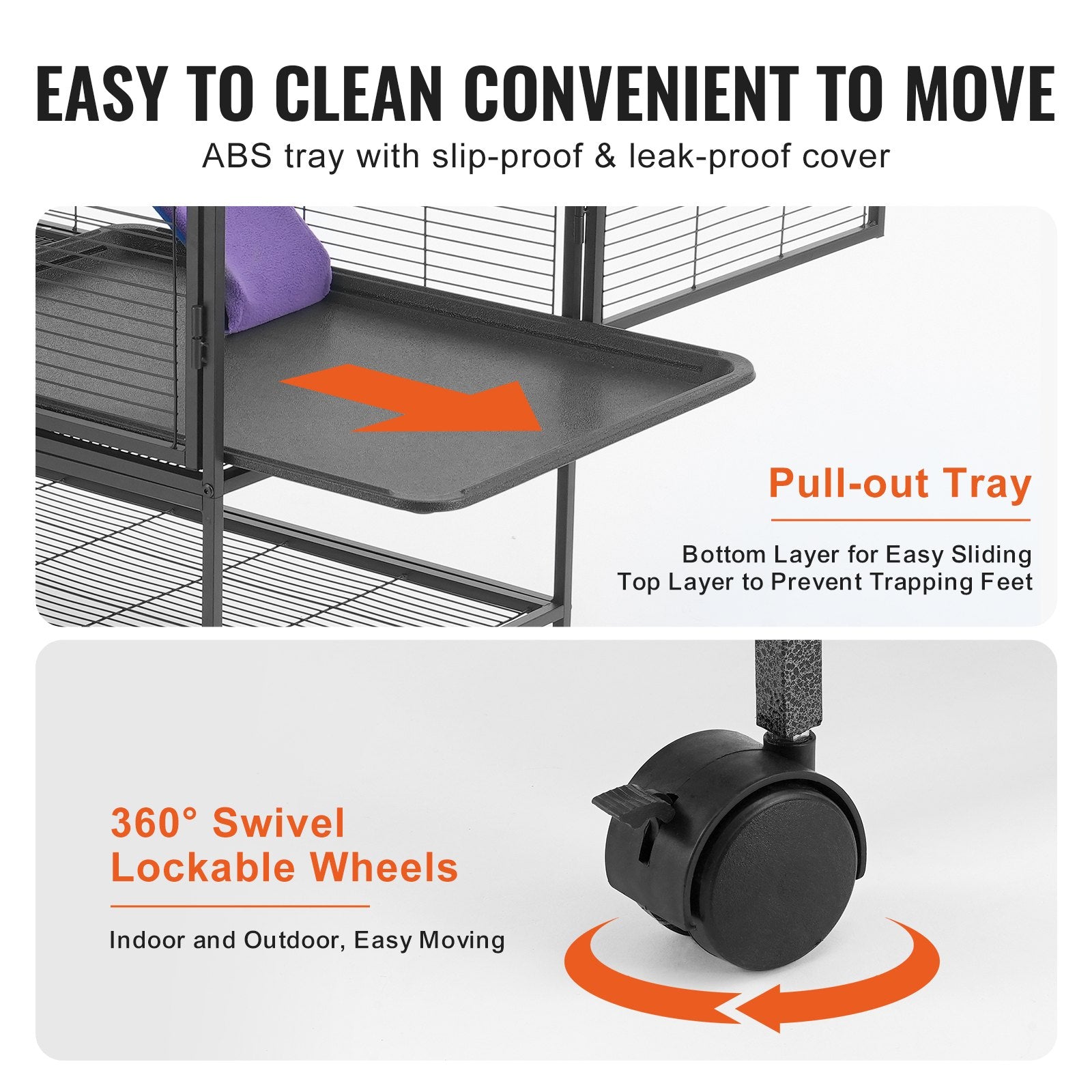 - Easy to Move and Store: Our metal rolling pet cage comes with lockable rolling wheels, allowing easily move your pets from indoors to outdoors, letting them enjoy sunlight and nature. Additionally, there's a large storage shelf above the wheels for keeping pet supplies organized and saving space.