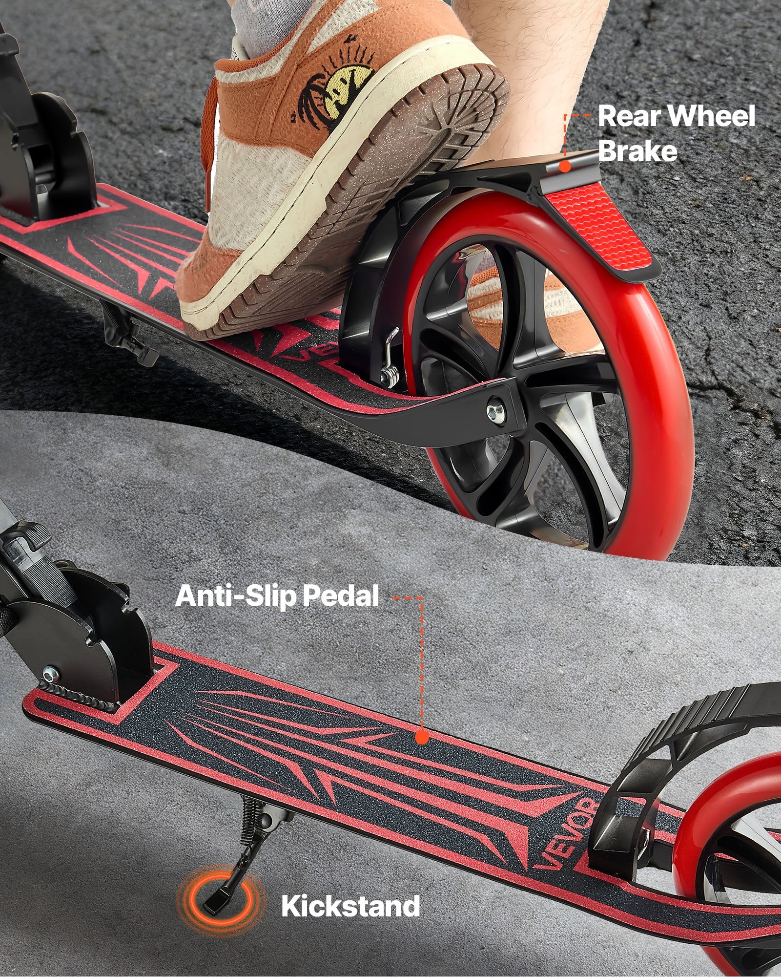 Sparkcykel för barn från 8 år, tonåringar och vuxna, 2-hjulig sparkcykel för småbarn med justerbart styre, brett halkfritt däck, hopfällbar, lättviktig för pojkar och flickor upp till 99,8 kg, svart + röd