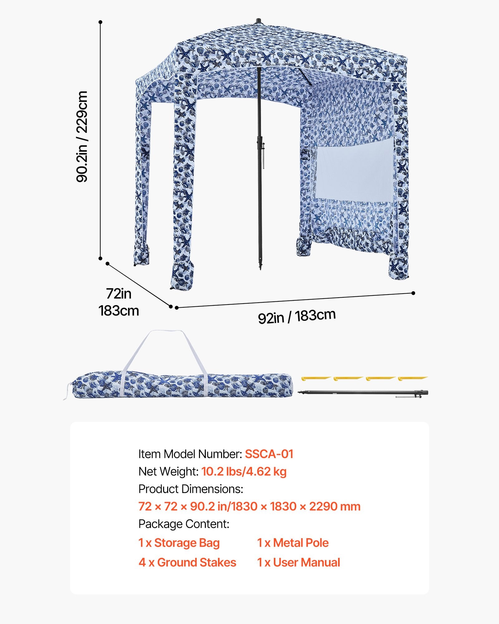 Beach Cabana, 1.83 x 1.83 m Beach Canopy with Side Wall, UPF 50+ Protection Easy Setup Cabana Tent with Sand Pockets, Large Outdoor Portable Shade, Sun Shelter Umbrella for Whole Family Friends