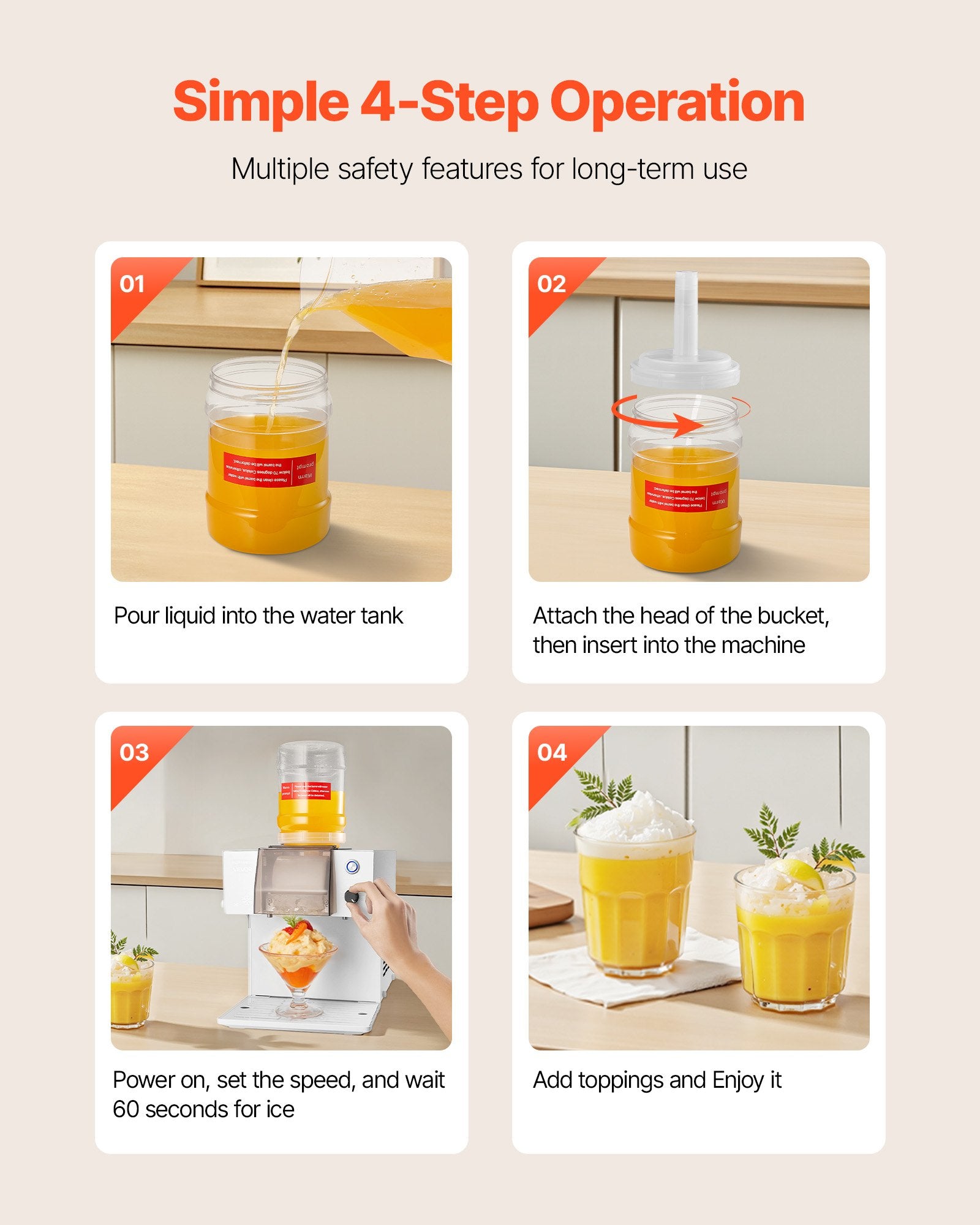 - Lätt att använda: Denna snöismaskin använder en enkel ratt för att justera hastigheten, så att du enkelt kan kontrollera isens konsistens. Dess intuitiva design gör den enkel att använda.