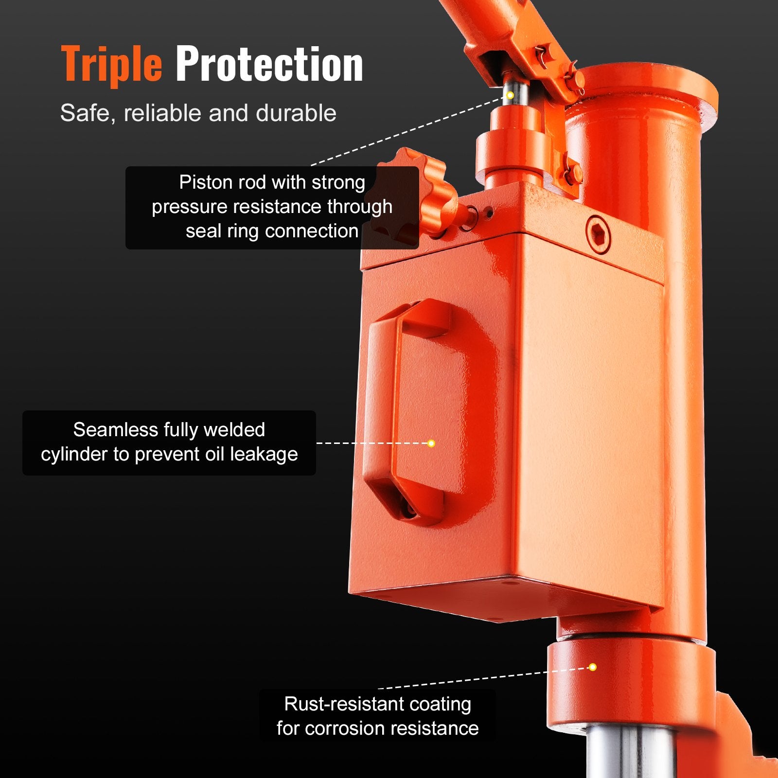 - Rostbeständigt sömlöst svetsat stål: Helsvetsad struktur som säkerställer stabilitet och minskar risken för oljeläckage. Tillsammans med slitstarka tätningar minimerar den friktionen på den inre stången och är därför lämplig för frekventa lyft. Det yttre lagret är belagt med en korrosionsbeständig yta, vilket garanterar långsiktig säkerhet och hållbarhet.