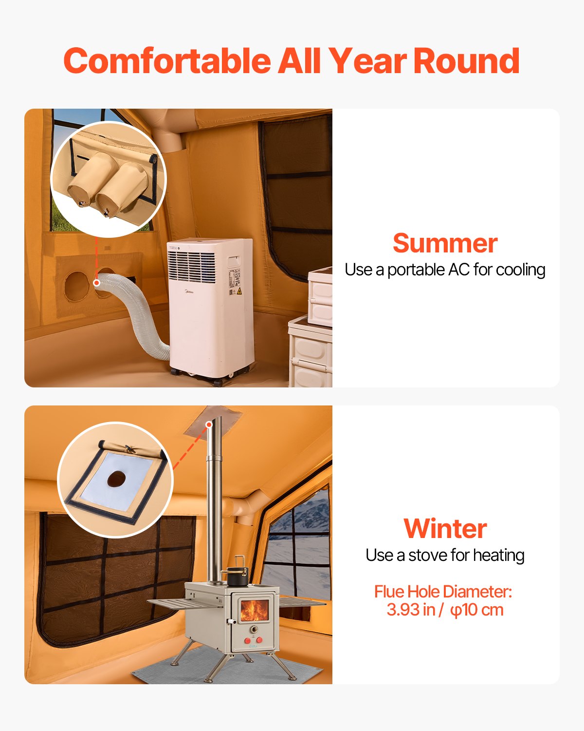 - 17,5 kvm Rymlig interiör: Med en yta på 17,5 kvm (15,75 x 11,81 x 7,22 fot / 4,8 x 3,6 x 2,2 m) rymmer detta uppblåsbara campingtält bekvämt 8–12 personer. Det inkluderar avtagbara gardiner för att skapa en planlösning med två sovrum eller ett rymligt vardagsrum. Utrustat med ett spisuttag och AC-uttag är det perfekt för användning året runt.