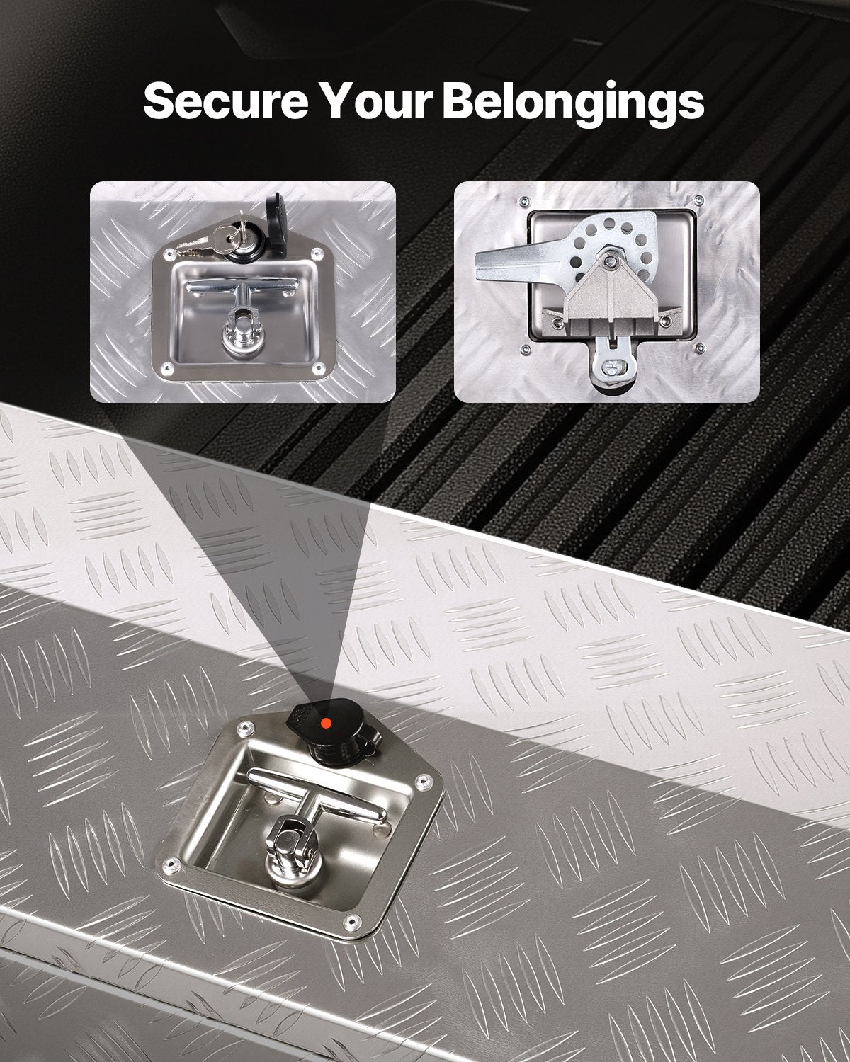 - Uppgraderad stöldskydd: T-handtagslåset ger starkare motståndskraft mot vandalism och levereras med två nycklar, vilket förhindrar inbrott. Denna aluminiumlastbilslåda skyddar dina verktyg när de parkeras på byggarbetsplatser eller parkeringsplatser.