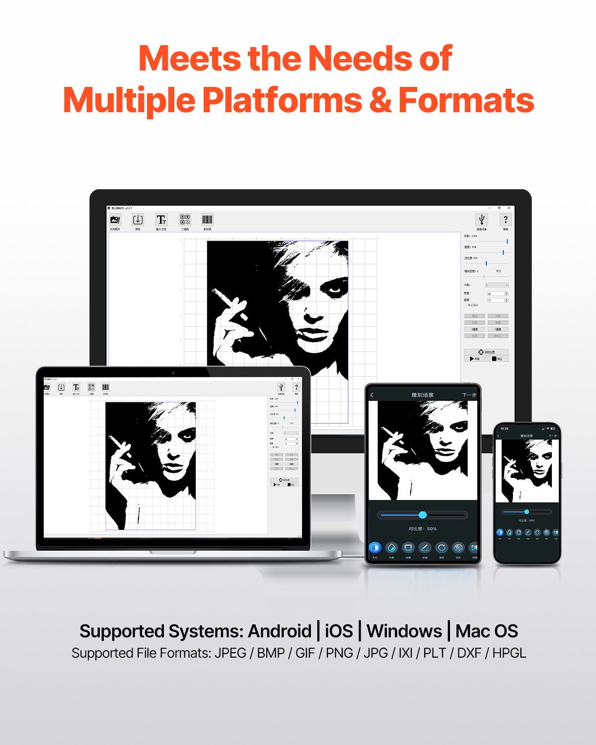 - Wide System Support: This portable engraving machine works with Android, iOS, Windows, and Mac OS. It supports various file formats, including JPEG, BMP, GIF, PNG, JPG, PLT, DXF, and HPGL, keeping flexibility for different users.