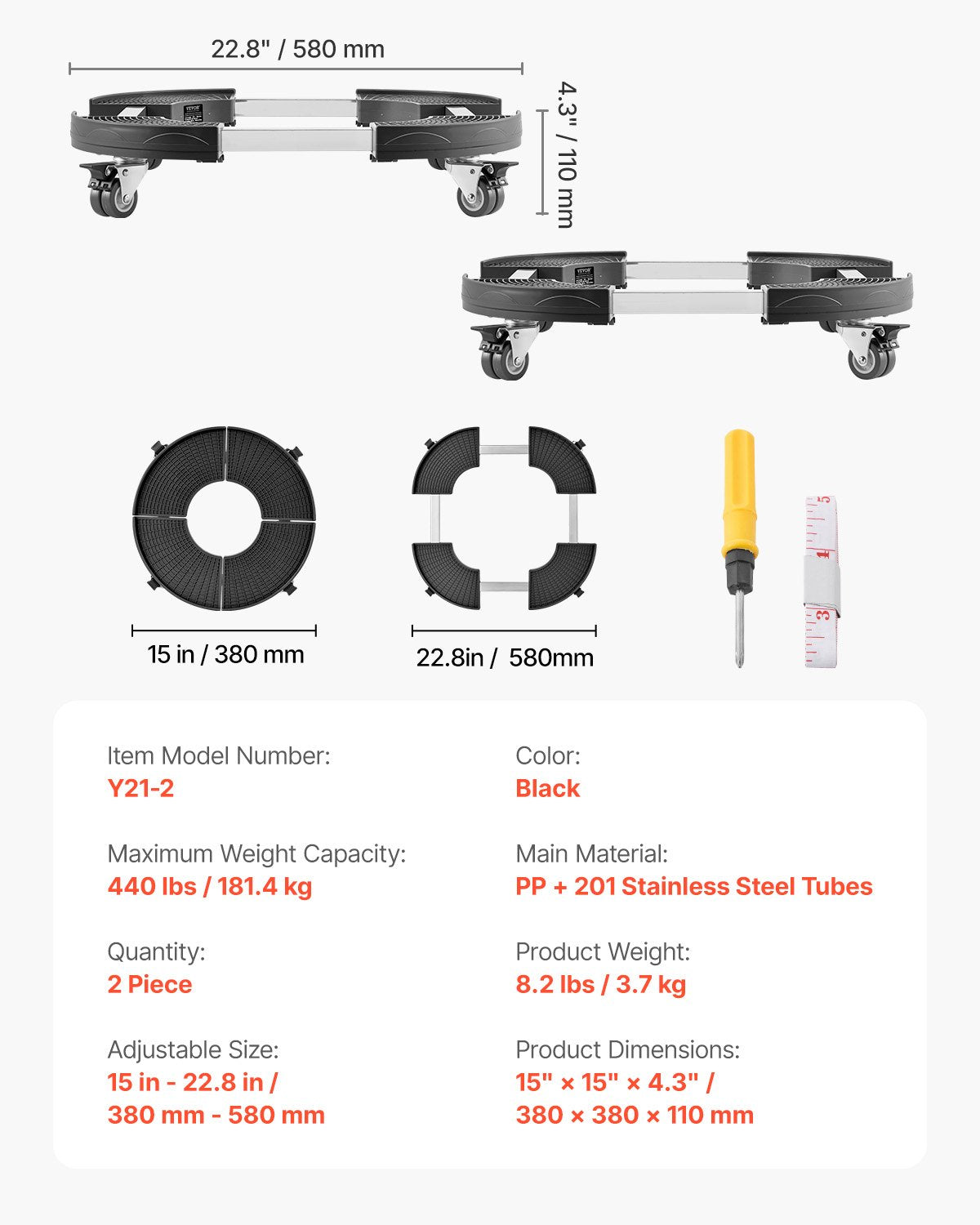 Papperskorg med 4 låsbara hjul, 180 kg viktkapacitet, 2-pack rund papperskorg med rullbas, 35-51 cm justerbar, kraftig växtvagn, multifunktionell rullvagn, svart