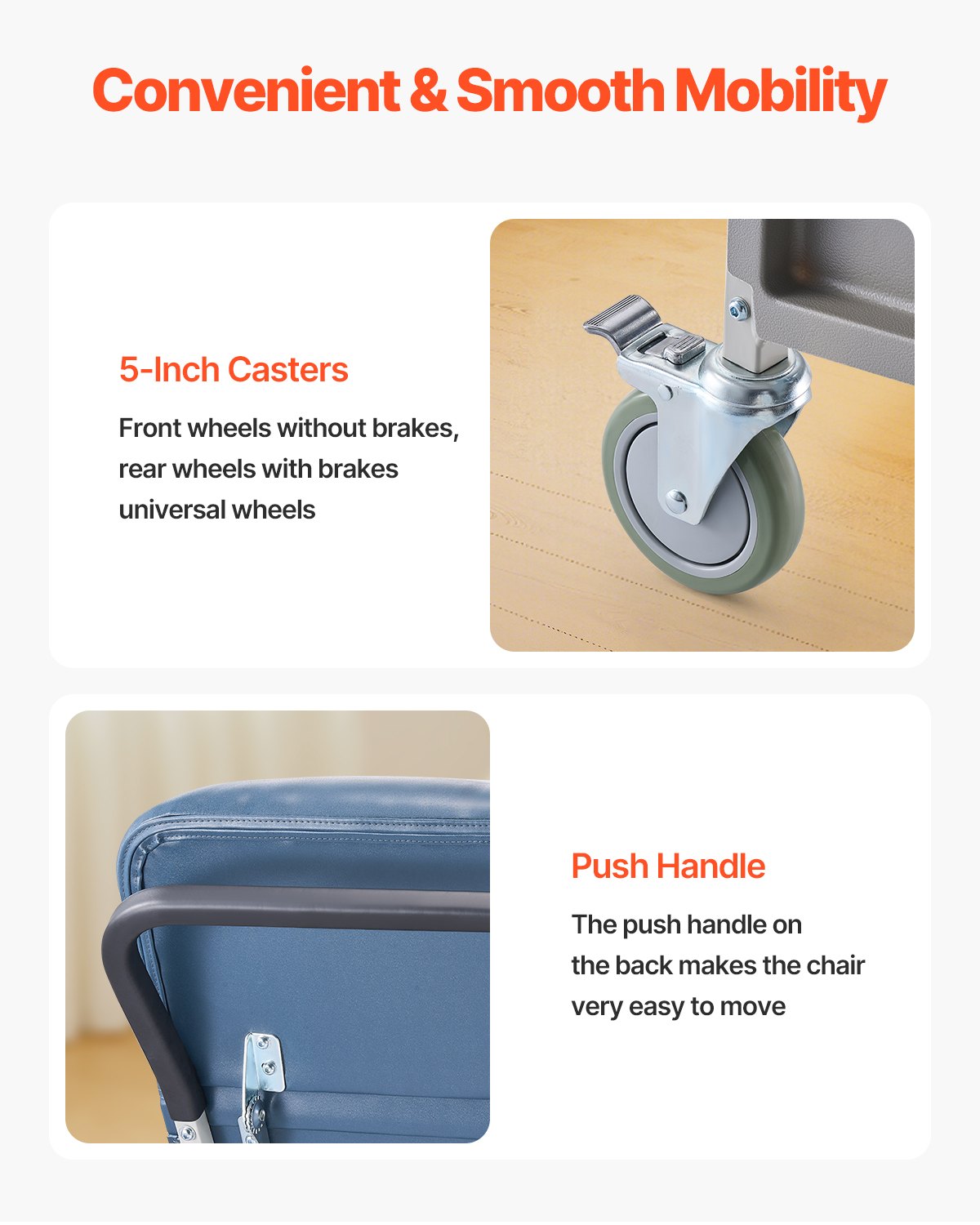 - Enkel rörlighet: Vår medicinska geri-fåtölj har fyra 5-tums (127 mm) mjukrullande hjul, inklusive 2 framhjul med riktningsfunktion och 2 låsbara universalhjul bak, tillsammans med ett bekvämt körhandtag, vilket säkerställer smidig rörelse och säker positionering i olika utrymmen.