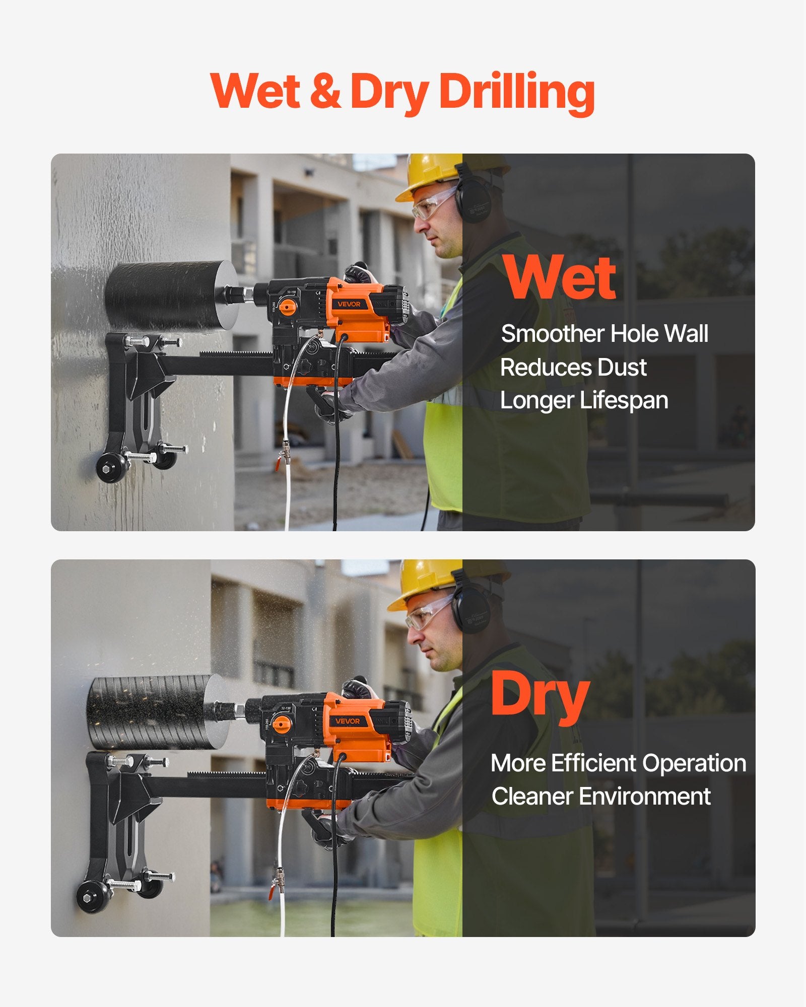 - Överlägsen hålkvalitet: Vår diamantkärnborrmaskin har både våt- och torrborrning. Våtborrningsalternativet spolar bort skräp och kyler borren med vatten, vilket minskar damm och förbättrar hålens jämnhet – perfekt för renoveringsarbeten inomhus