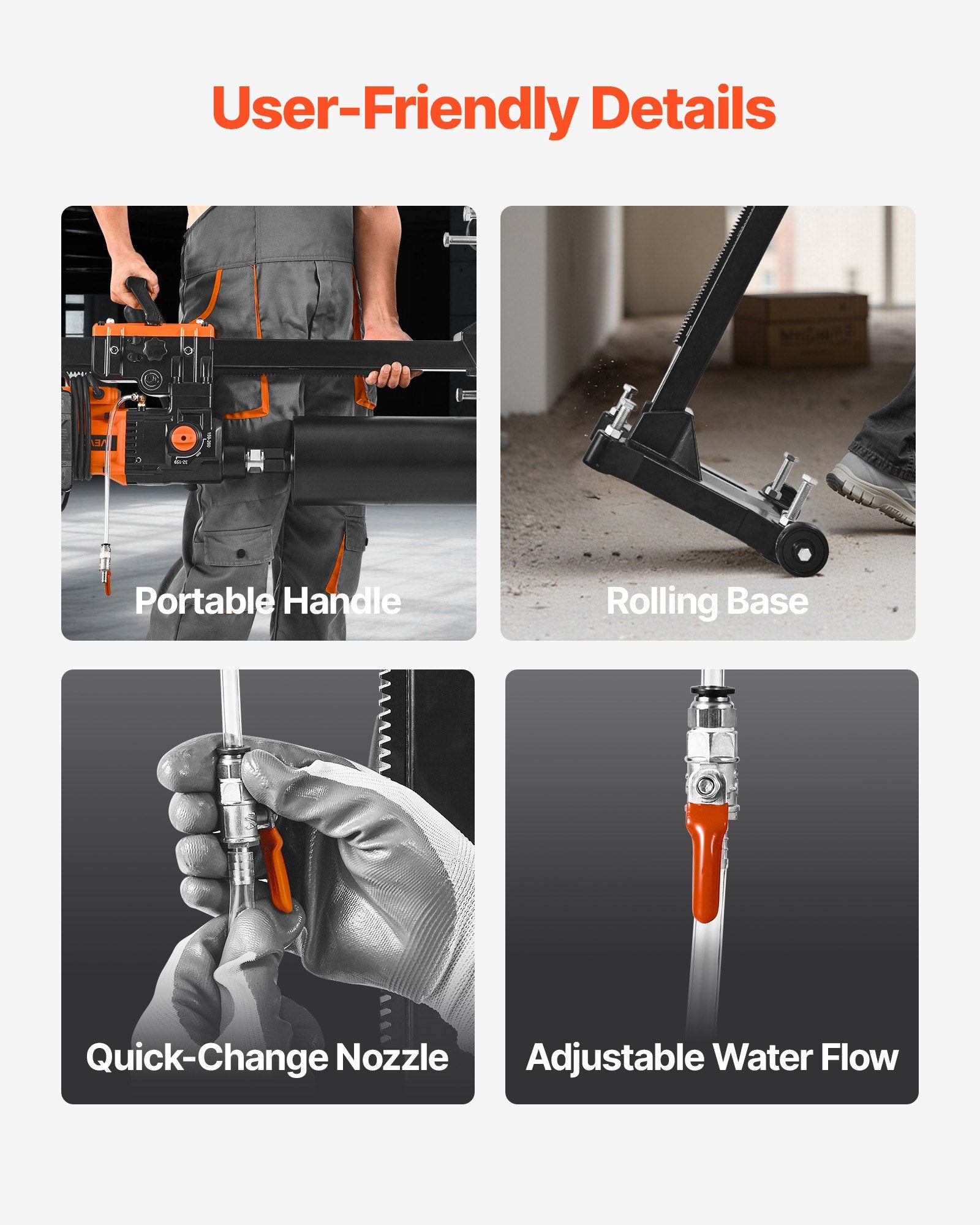 - Byggd för att hålla: Tillverkad med ett lätt men ändå tåligt aluminiumhölje, motstår denna kärnborrrigg slitage. Den har hjul för enklare transport. PVC-vattenslangen är sprickbeständig och den utgående stålaxeln ger konsekvent noggrannhet.