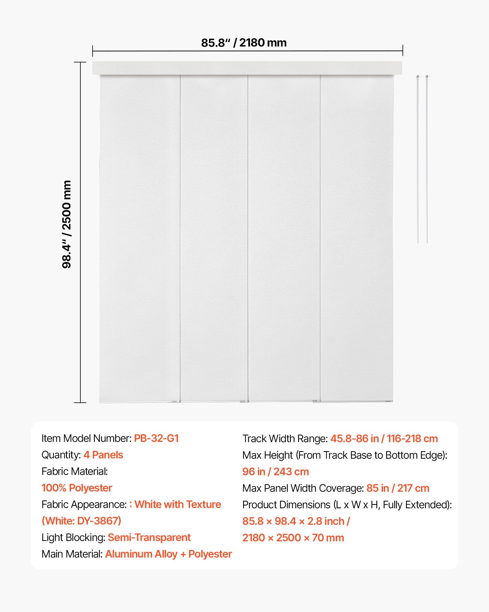 Panelgardiner, utdragbara skenor från 116 cm till 218 cm B, trimbara panelgardiner upp till 243 cm H, justerbara vertikala panelgardiner för skjutdörrar, altandörrar, rumsavdelare, fönster, vit