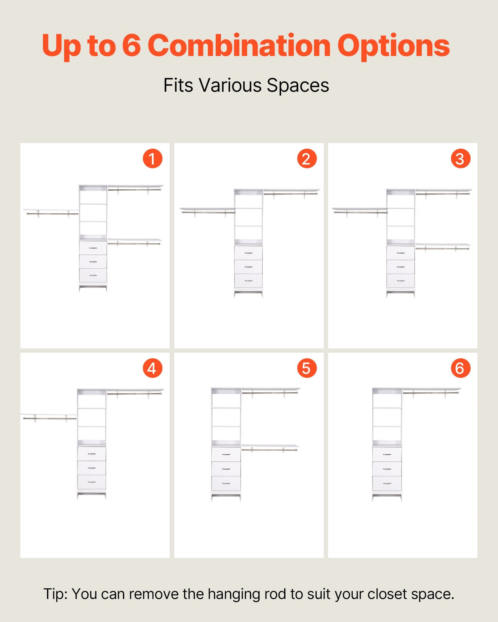 - Flexibel konfiguration: Stängerna kan roteras eller tas bort för att passa din garderobsutrymme. Flera layouter gör den lämplig för sovrum, tvättstugor eller klädkammare