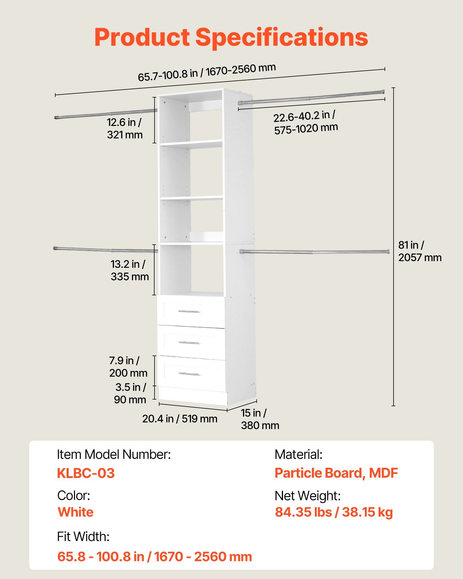 - Justerbar design: Hängstången kan justeras från 575–1020 mm, och hyllorna erbjuder 5 höjdnivåer med steg om 32 mm. Inkluderar 3 utdragbara lådor för mångsidig förvaring.