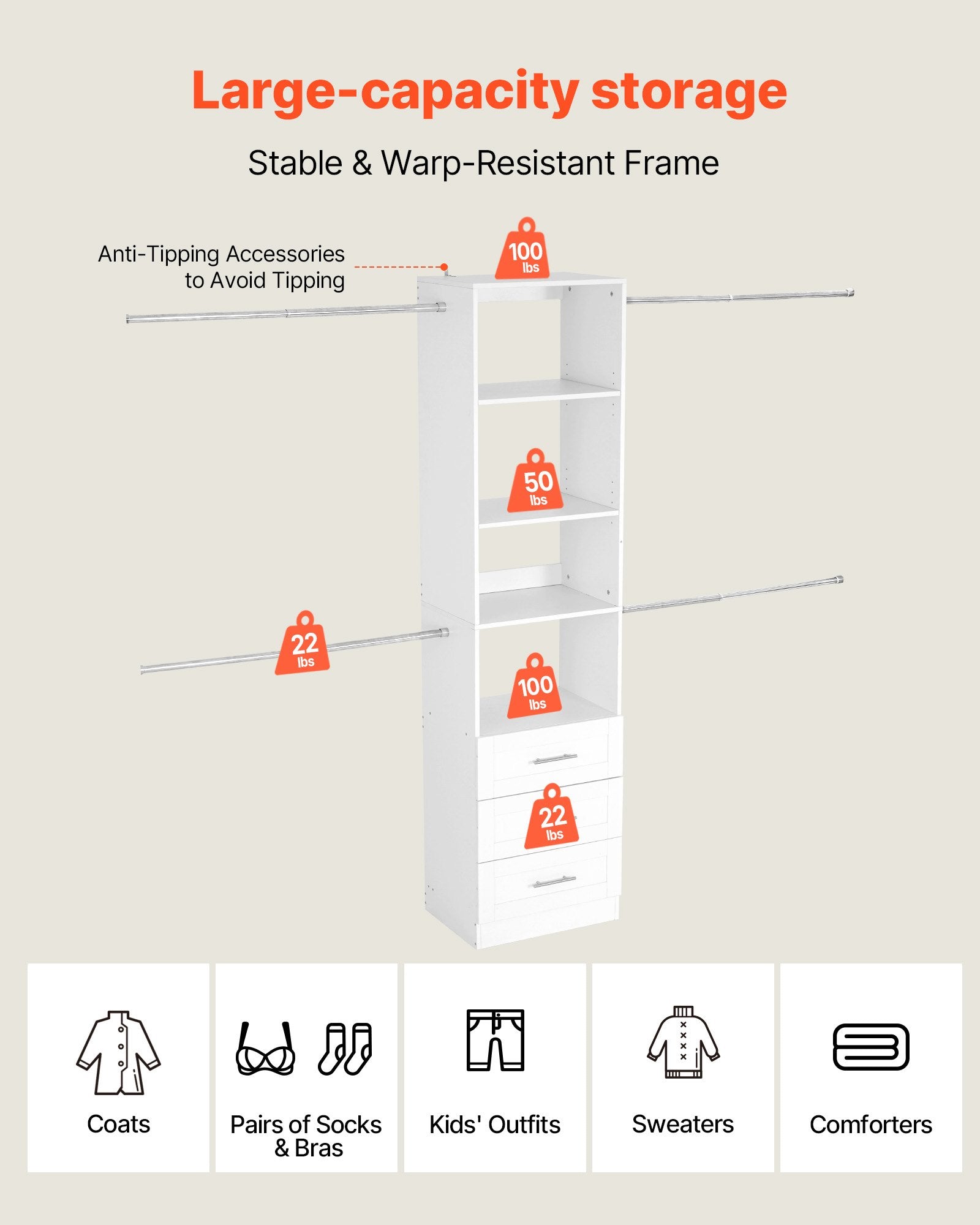 - Stor kapacitet: Detta garderobssystem med lådor klarar upp till 362,7 kg och rymmer cirka 100 plagg. Använd facken för att separera föremål snyggt, så att allt är synligt och lättåtkomligt.