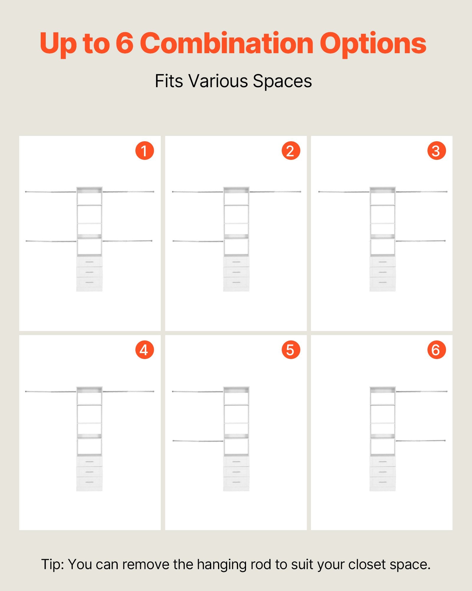 - Flexibel konfiguration: Stängerna kan roteras eller tas bort för att passa din garderobsutrymme. Flera layouter gör den lämplig för sovrum, tvättstugor eller klädkammare