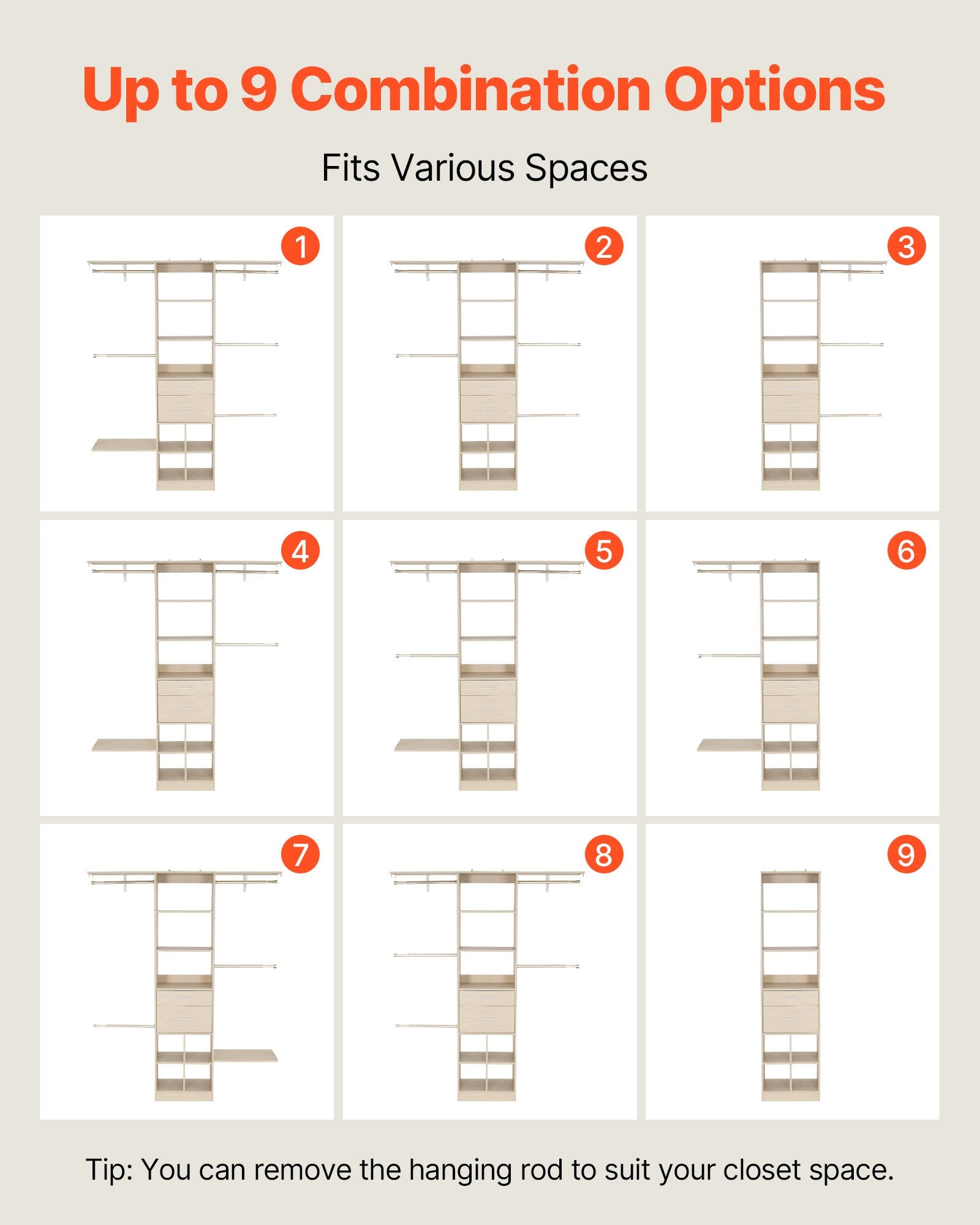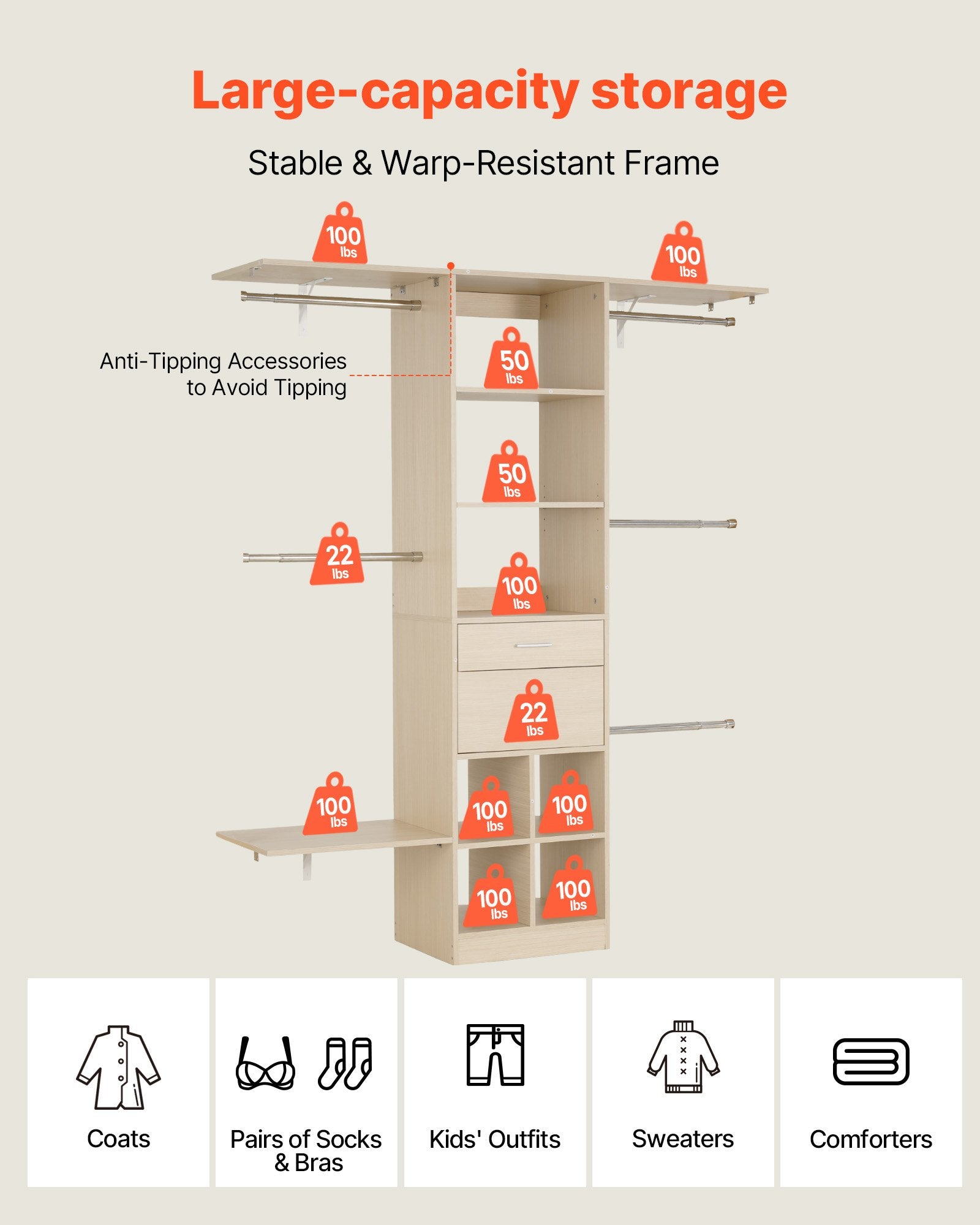 - Zonförvaring: Trähyllan i garderoben har 17 fack för att hänga, visa upp eller stapla kläder, vilket gör det enkelt att organisera säsongskläder och sängkläder för en familj på tre eller en enskild person.
