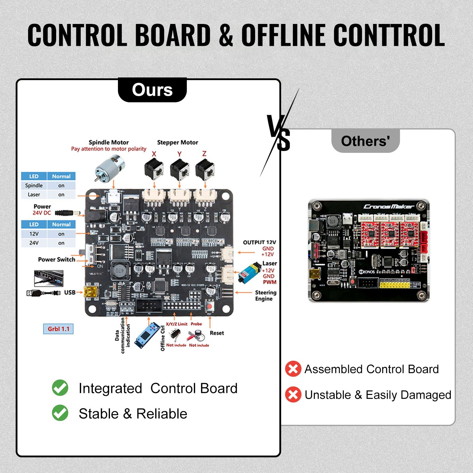 - Uppgraderat styrkort: Den integrerade GRBL-kontrollen har full funktionalitet och stabilitet. Fördelarna med offline-kontrollen ligger i följande: 1. Ingen anslutning till datorn behövs; 2. Godtyckligt val av offline-filer för gravering. 3. Justera manuellt X-, Y- och Z-axlarnas position som gravyrens startpunkt, slå manuellt på eller av spindeln. 4. Hög precision: mindre än 0,003 tum.