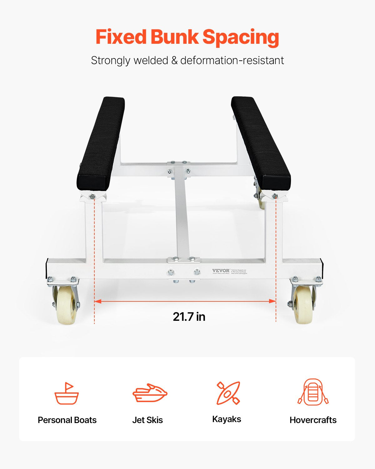 - Fast avstånd: Med ett fast avstånd på 59 cm, fastsvetsat, ger denna vattenskotervagn högre bärförmåga och stabilitet, perfekt för medelstora till stora båtar. Den undviker tippning under transport, vilket säkerställer säkrare förflyttning.