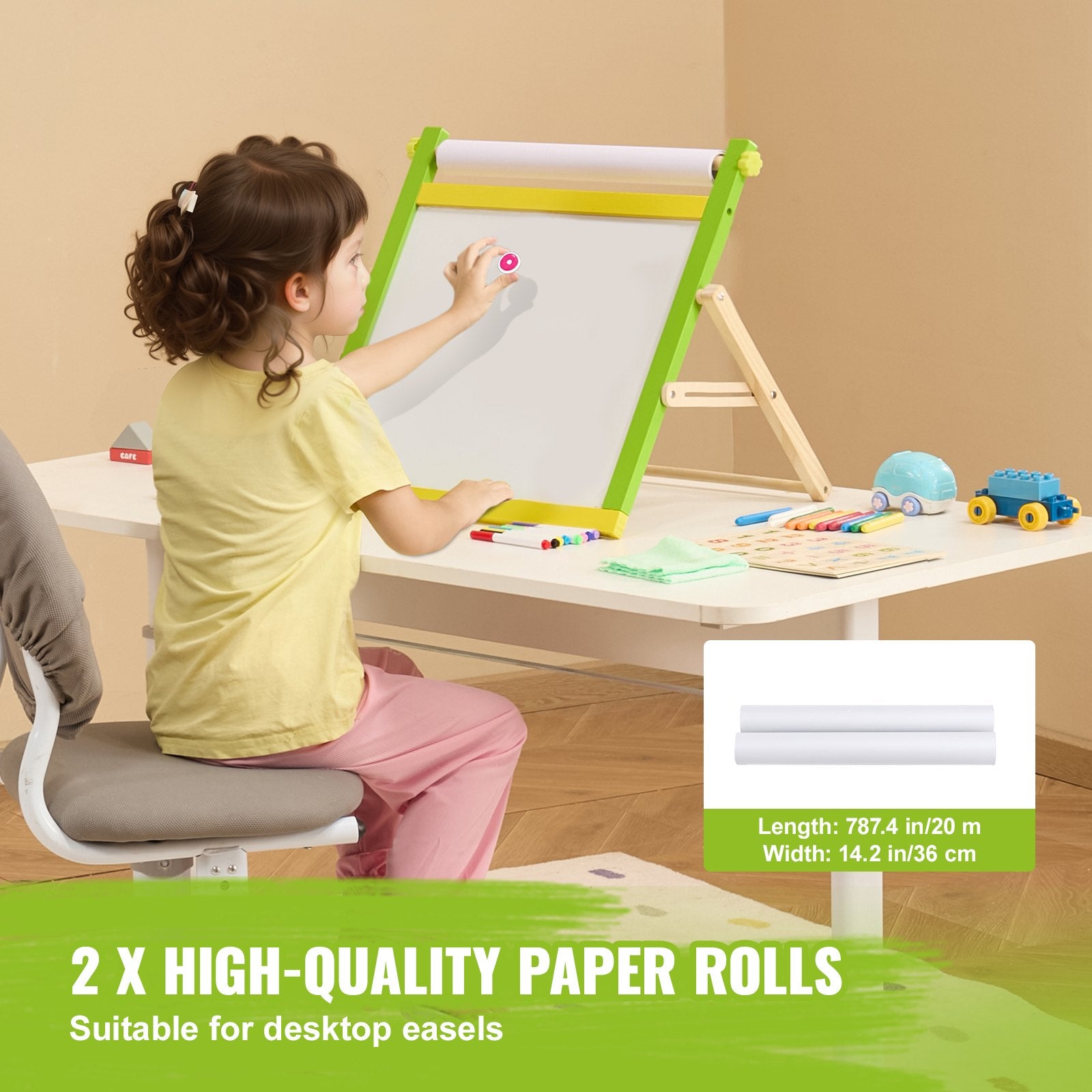 - Allt-i-ett-konstset: Detta stafflitillbehörsset innehåller 24 dammfria kritor, 6 markörer och 2 pappersrullar – perfekt för barn i åldrarna 3 till 10 år. Oavsett om de gillar att klottra, skriva eller rita, ger detta set allt de behöver för ett roligt och kreativt äventyr!
