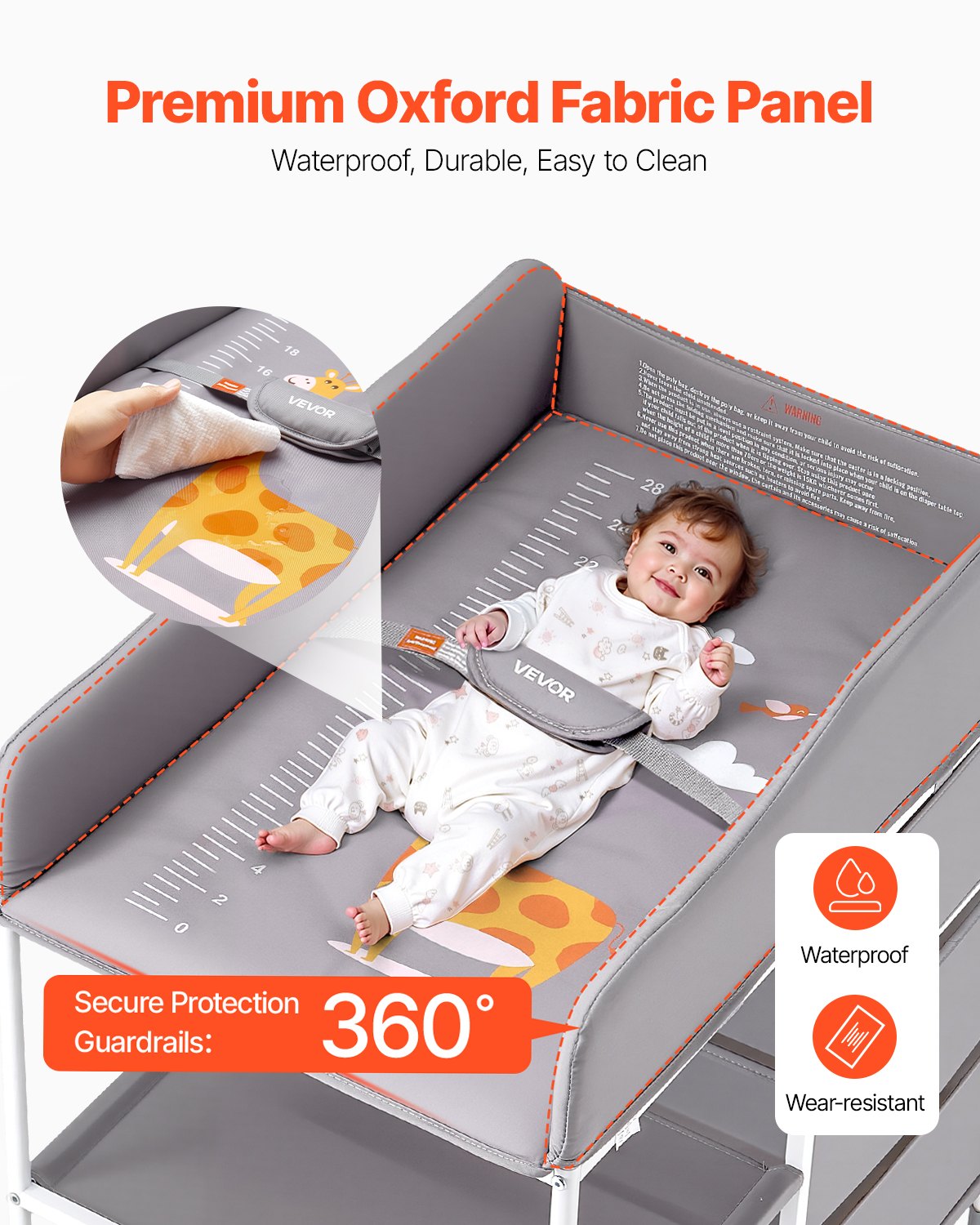 - Slitstarka material: Skötbordet är tillverkat av premiummaterial och har paneler i Oxford-tyg som är vattentäta, slitstarka och lätta att rengöra, vilket garanterar en bättre användarupplevelse och långvarig hållbarhet.