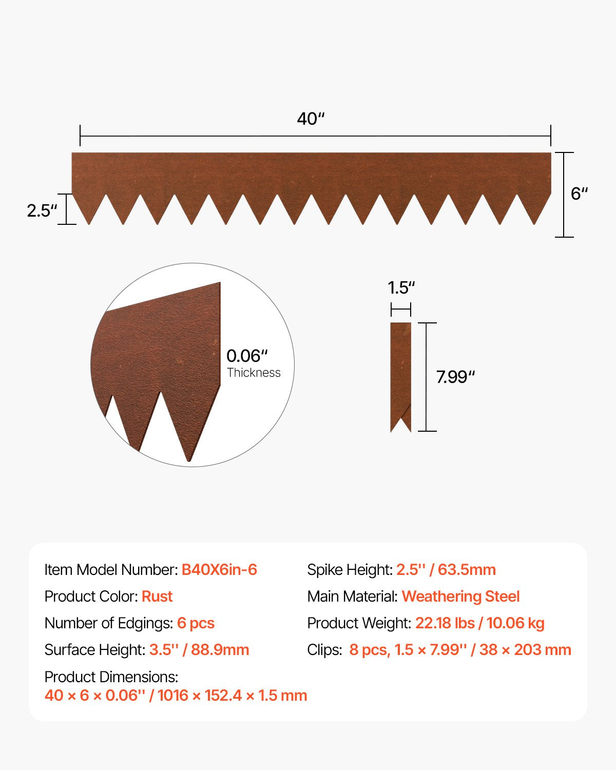 • Väderbeständig och rostbeständig: Denna gräsmattekant är tillverkad av väderbeständigt stål och är förrostad i kanterna. Med tiden fördjupas rosten och skapar ett skyddande lager som förbättrar korrosionsbeständigheten och förhindrar sprickbildning. När rosten är helt bildad kan du applicera ett lager polyuretanfärg för att bevara färgen och förlänga dess livslängd.