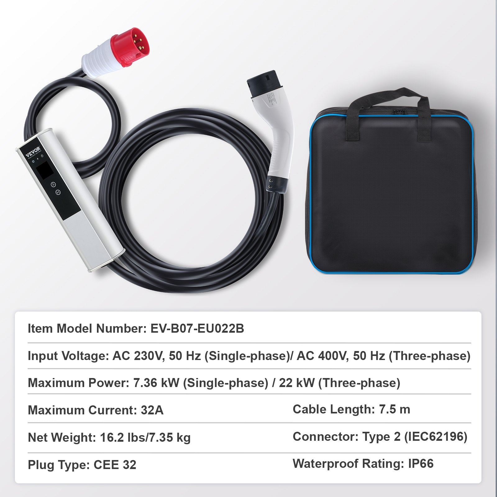 Bärbar elbilsladdare typ 2, 32A 7,36 kW/22 kW, elbilsladdare med 7,5 m laddningskabel CEE 32-kontakt LCD, IEC 62196 laddstation för elbilar med bärväska och laddningskabelkrok, IP66