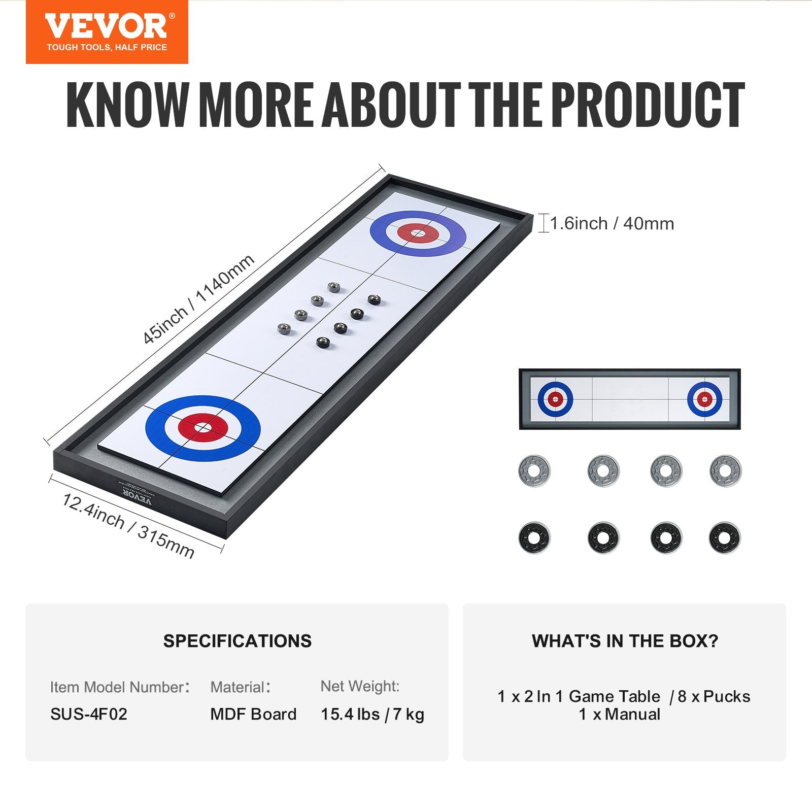 - 2-Sided Playing Board: Experience double the fun with your family, featuring shuffleboard on one side and curling on the other.