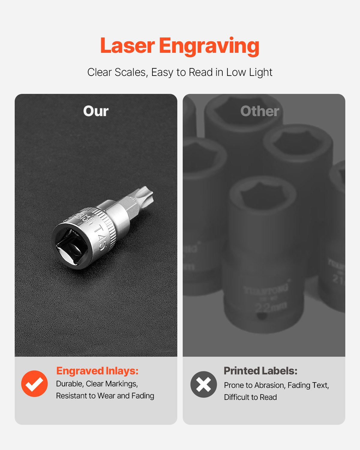 - Tydliga markeringar: Torx-bitssetet har djupt graverad, slitstark text som inte bleknar eller lossnar. De större, tydligare markeringarna gör det snabbt och enkelt att identifiera rätt storlek för jobbet.