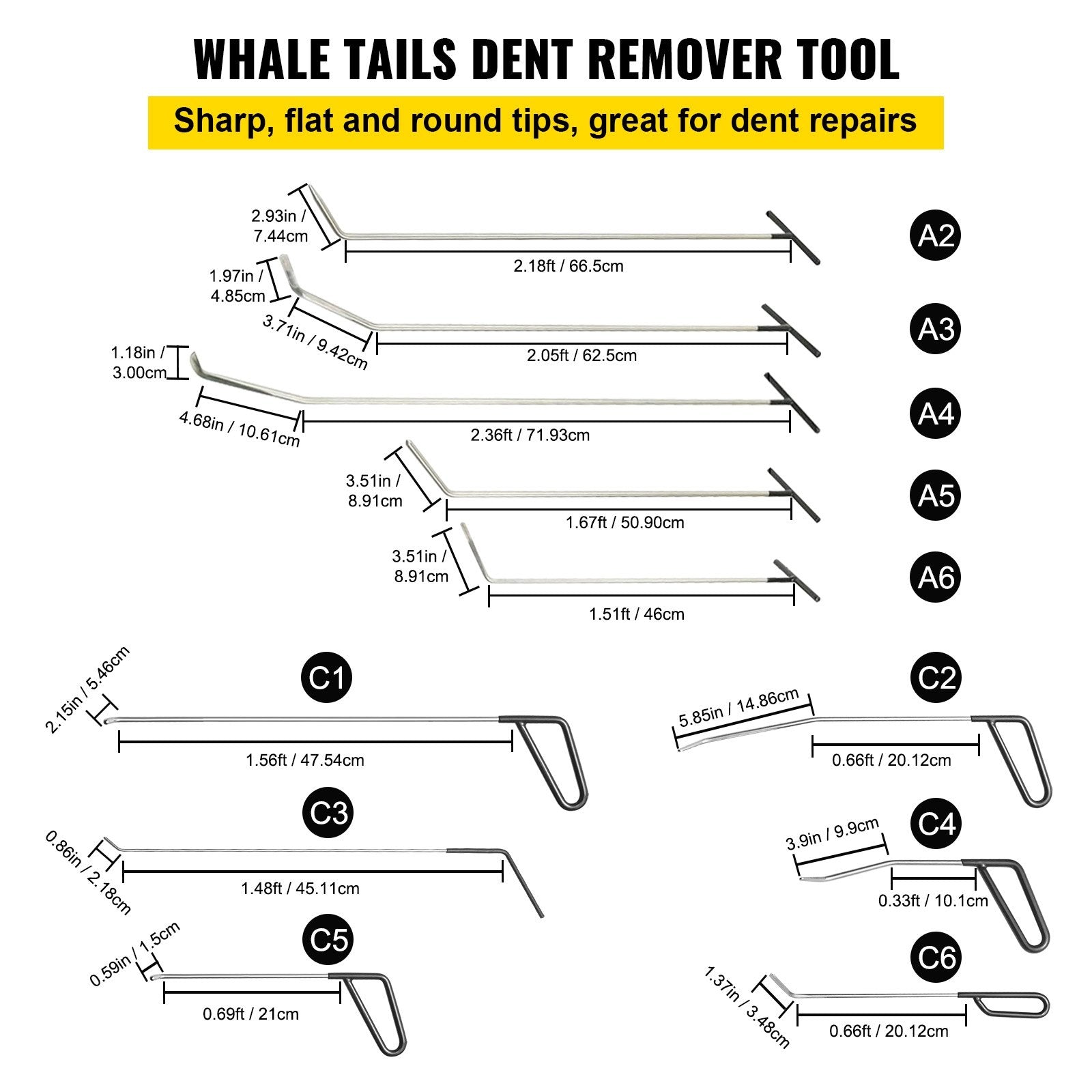 - 21 st bucklorborttagningsstavar: Innehåller 21 st bucklorborttagningsstavar i olika storlekar (A2-A6, B2-B11, C1-C6). Denna stavset tillhör långa stavar med olika spetsformer. Längdintervallet är 0,72 fot till 2,69 fot. Speciellt lämplig för bucklor i bilar i djupa vatten där våra händer är oåtkomliga.