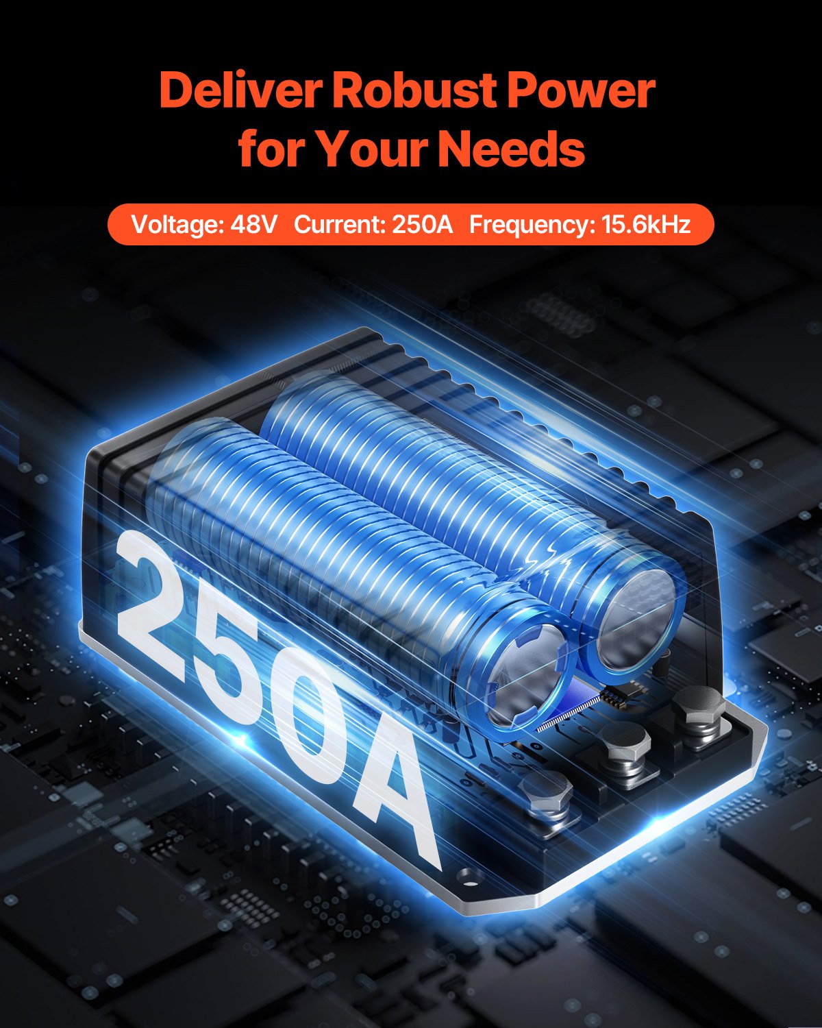 - Stable Performance: With 48V and 250A output, this golf cart motor controller delivers smooth, steady power to the motor. The 15.6kHz high-frequency regulation and quick start function enhance efficiency and responsive acceleration. It supports stepless speed adjustment and reverse braking for precise and seamless driving