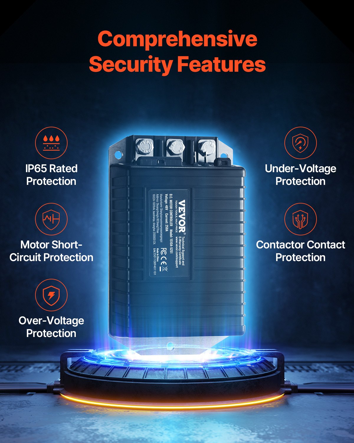 - All-Around Protection: This golf cart controller features built-in motor short-circuit, over-voltage, under-voltage, contactor contact, and temperature protections. IP65 waterproof is suitable for harsh weather and challenging environments, ensuring secure and reliable operation