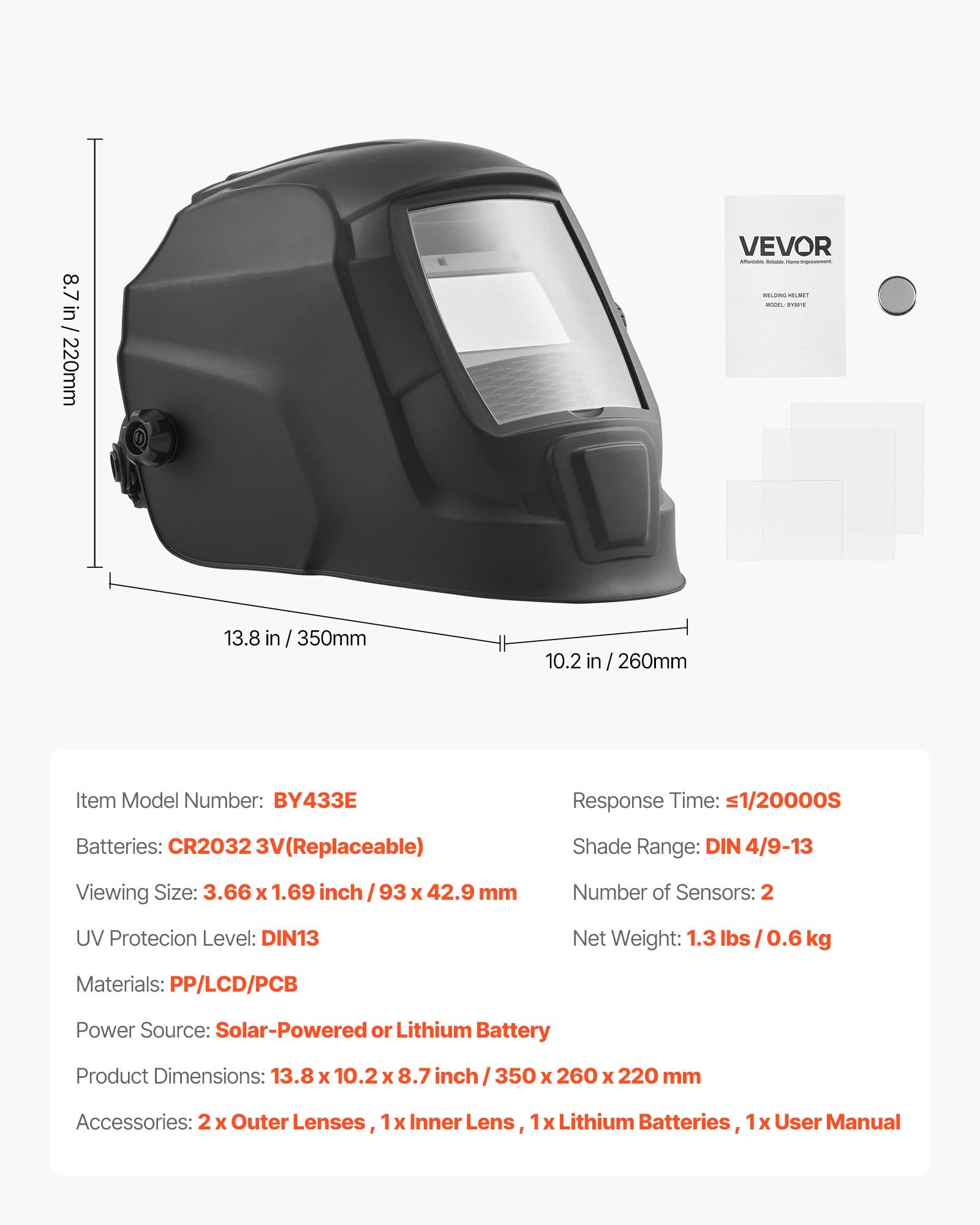- Färggenomgång: Med en stor skärm på 93 x 43 mm (3,66 x 1,69 tum), uppgraderad färggenomgångsteknik och 1/1/1/1 optisk klarhet ger VEVOR-svetshjälmen dig en tydlig, skarp och naturlig vy för säkrare och mer exakt svetsning.