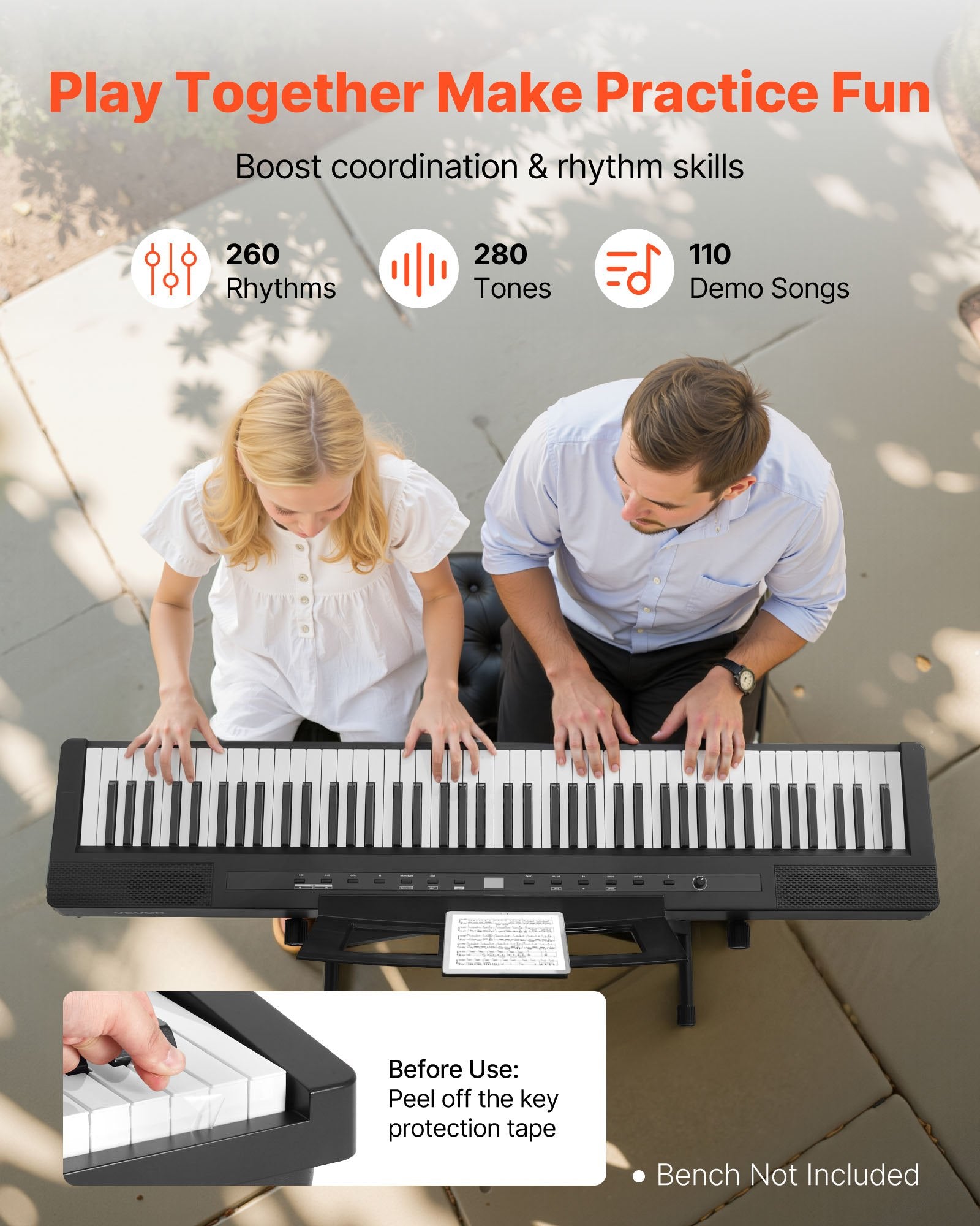 - Dubbelt tangentbordsdesign: Det dubbla tangentbordsläget låter lärare visuellt vägleda och demonstrera tekniker. Detta klaviatur med 88 fullt viktade tangenter gör det möjligt för elever att direkt härma rytmer och färdigheter för snabbare framsteg.