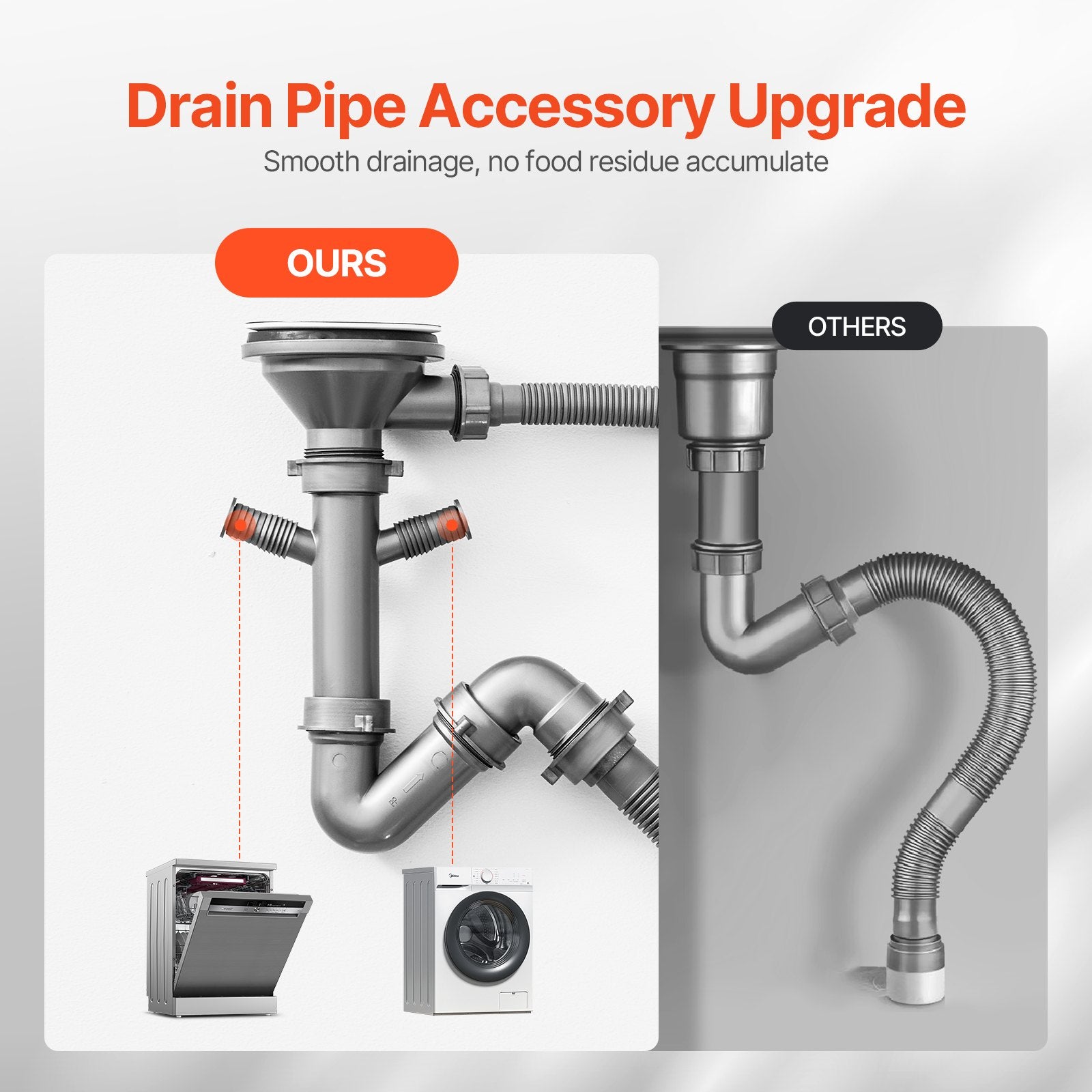- Snabbt dräneringssystem: Denna diskho med bar har en X-formad avloppsdesign i botten, utrustad med ett avloppskit för att säkerställa snabb dränering och förhindra vattenansamling. Den inkluderar också en avloppsöppning på sidan och två vattenrörsanslutningar för anslutning av diskmaskiner, vilket möjliggör smidig dränering utan matrester.