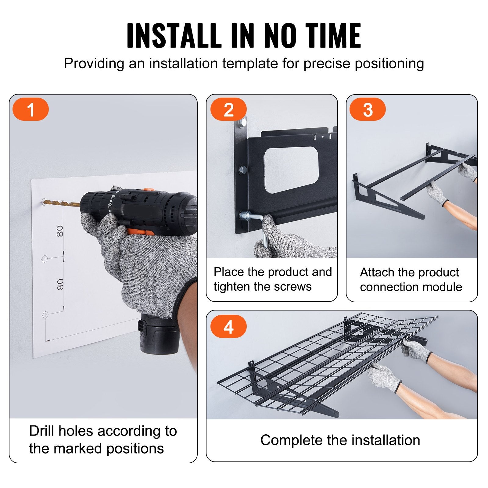 - Enkel installation: Vägghyllorna i garaget använder en modulär monteringsdesign. Placera bara positioneringspappret för hålen, montera fästena, dra åt skruvarna och du är redo. Det nedre verktygsstället kan separeras från andra förvaringsanordningar enligt dina specifika behov.