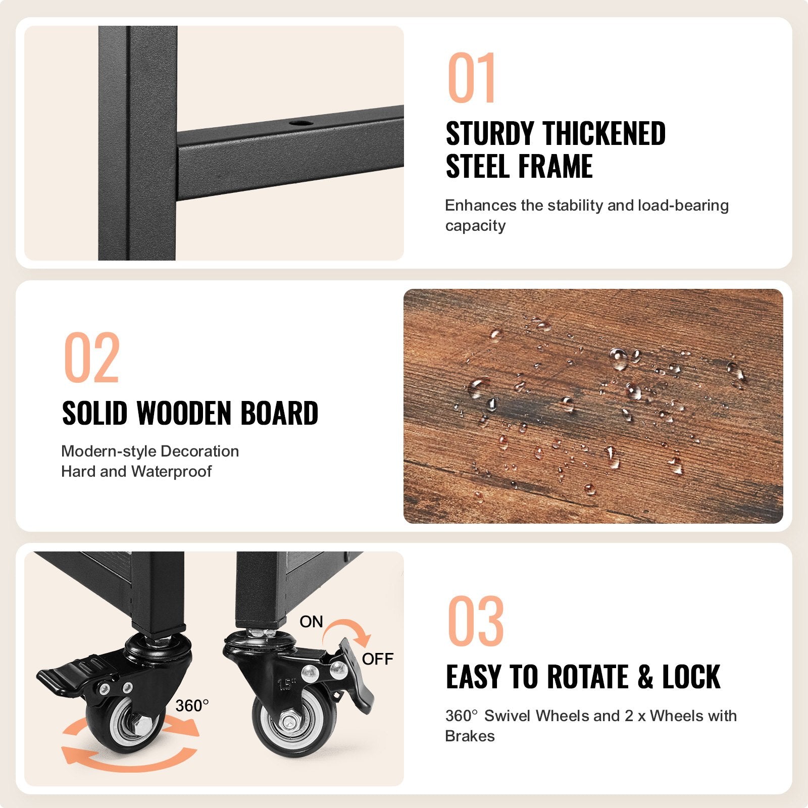 - Robust metallkonstruktion: Denna värmepressvagn är byggd med en hållbar metallram och premiumträ, är robust och har utmärkt bärförmåga. Diamantsliphjulen säkerställer stabilitet, även när den är fullastad.