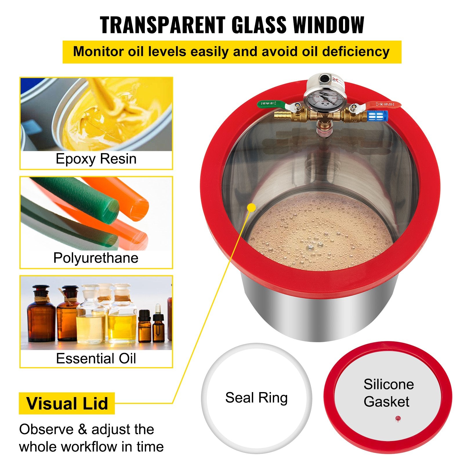 - Högt tätande transparent lock: Kammarens transparenta fönster är praktiskt för att upptäcka oljenivåer och förhindra att motorn brinner på grund av oljebrist. Denna högkvalitativa kammare är perfekt för avgasning av uretaner, silikon, epoxi, utvinning av eterisk olja, hartsgjutning och trästabilisering. Känn din maskin utan och innan och känn skillnaden från konkurrenterna; kraft och effektivitet som du kan se och känna.