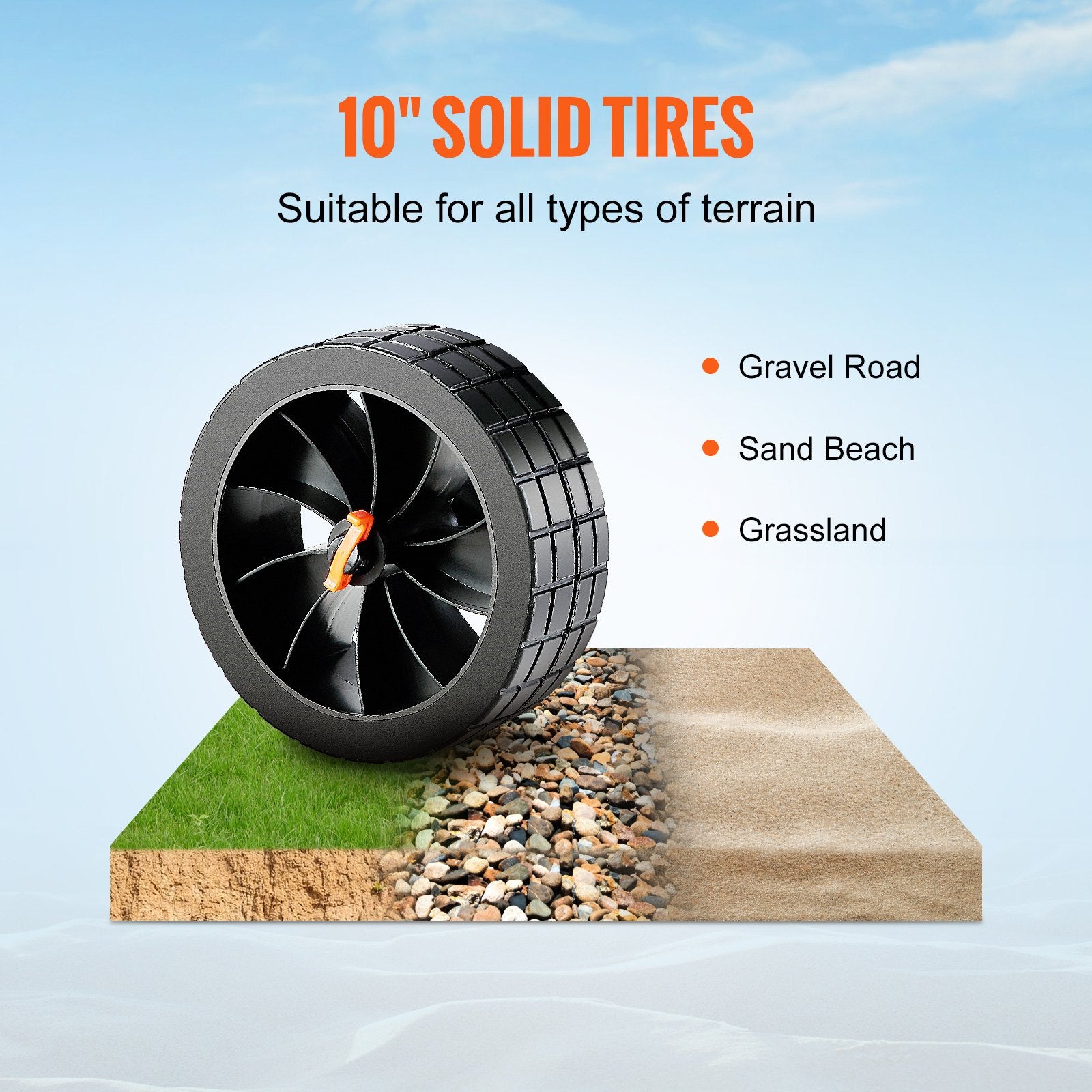 - Terränghjul för alla typer av terräng: Vår kajakvagn är utrustad med 25 cm däck med massivt däck, som inte behöver pumpas eller tryckkontrolleras. De stora hjulen absorberar stötar bättre och tar sig igenom hinder, vilket gör vagnen lämplig för all terräng, inklusive gräsmarker, sandstränder och grusvägar.