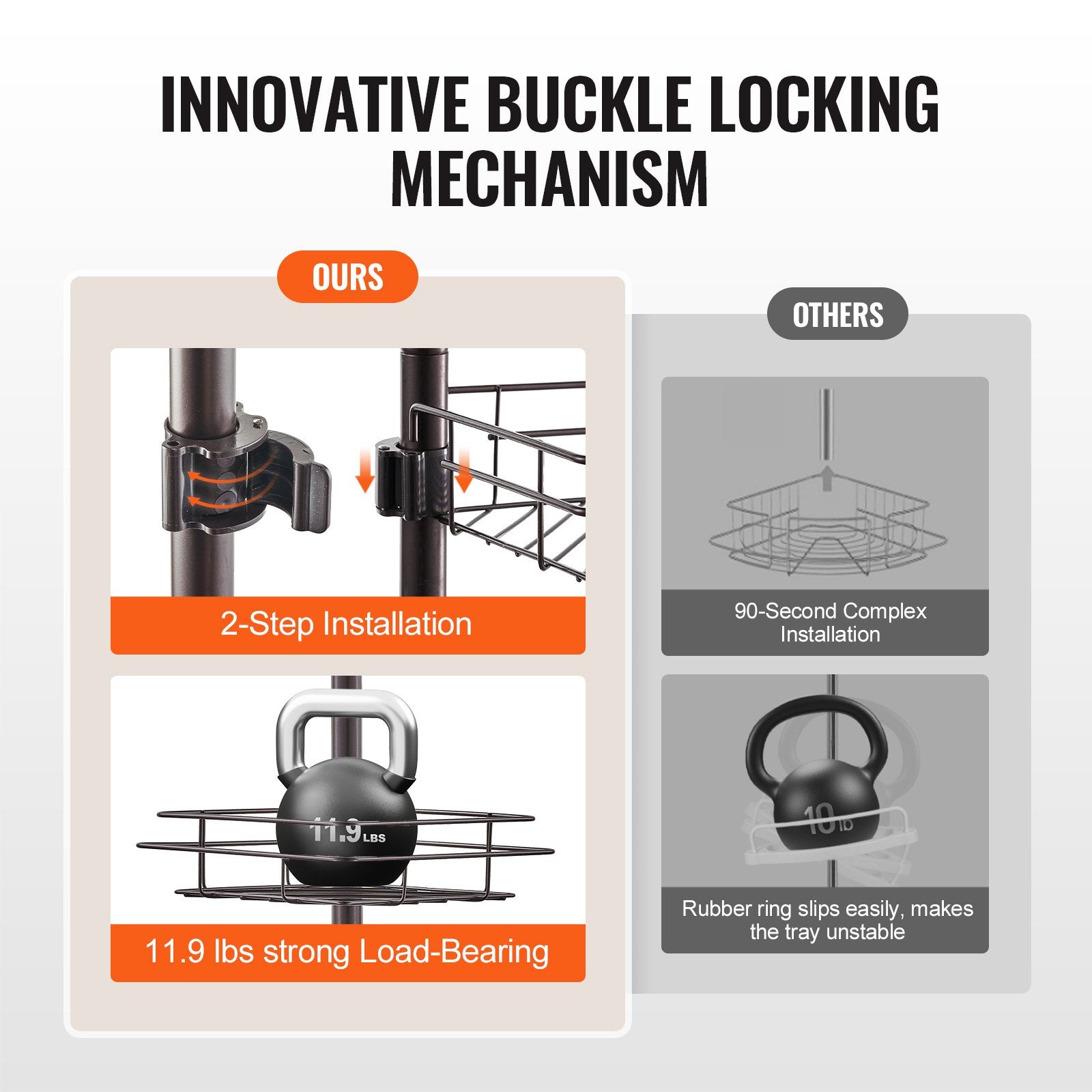 - Innovativ spänndesign: Duschhörnstolpen är utrustad med en innovativ spännlåsningsanordning som förenklar och stabiliserar installationsprocessen och effektivt förhindrar att brickan glider. Dess starka lastbärande bricka klarar enkelt upp till 5,4 kg tunga laster, vilket ger en säker plats för dig att använda.