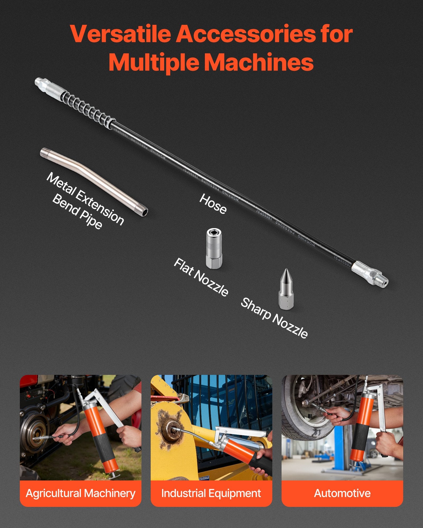 - Full Compatibility: This pistol grip grease gun includes a sharp nozzle, flat nozzle, hose, and metal bend pipe. It fits the grease fittings of all sizes and positions, meeting lubrication needs for repair shops, individuals