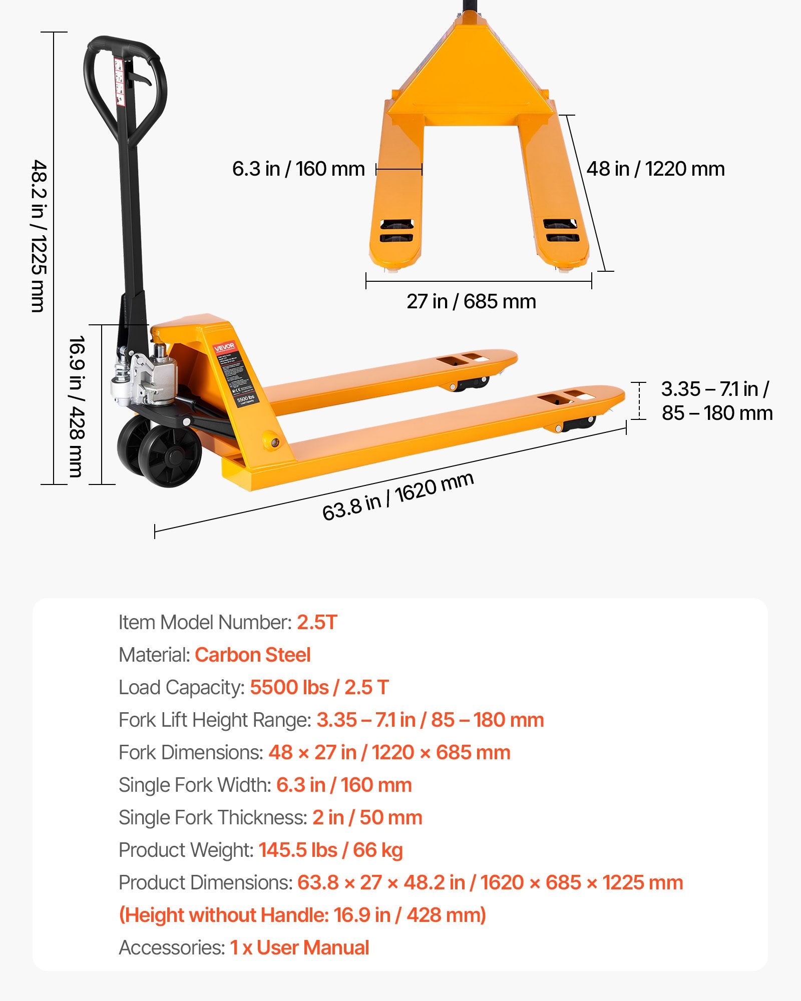 Palltruck, 2,5 ton lastkapacitet, manuell palltruck med gafflar på 122 l x 68,6 b cm för materialhantering, lyfthöjd 85–180 mm, lämplig för lager, stormarknad, tillverkning